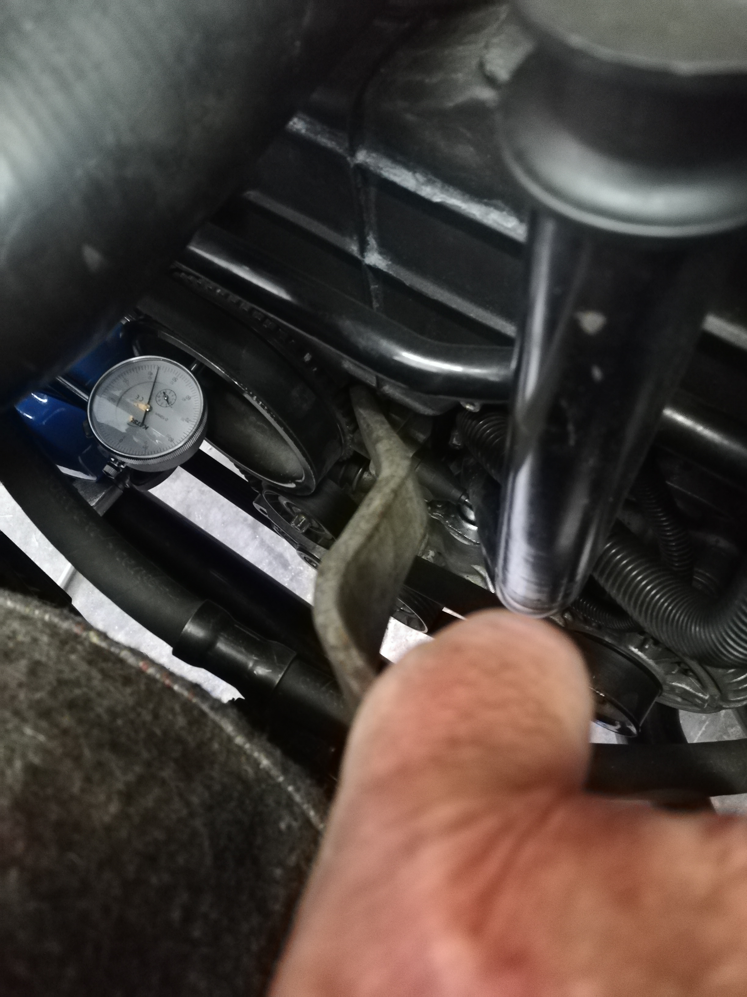 Toujours avec un démonte pneu, déplacement de la poulie du vilebrequin vers l'avant (attention au capteur de PMH), et on note le résultat : 58,5