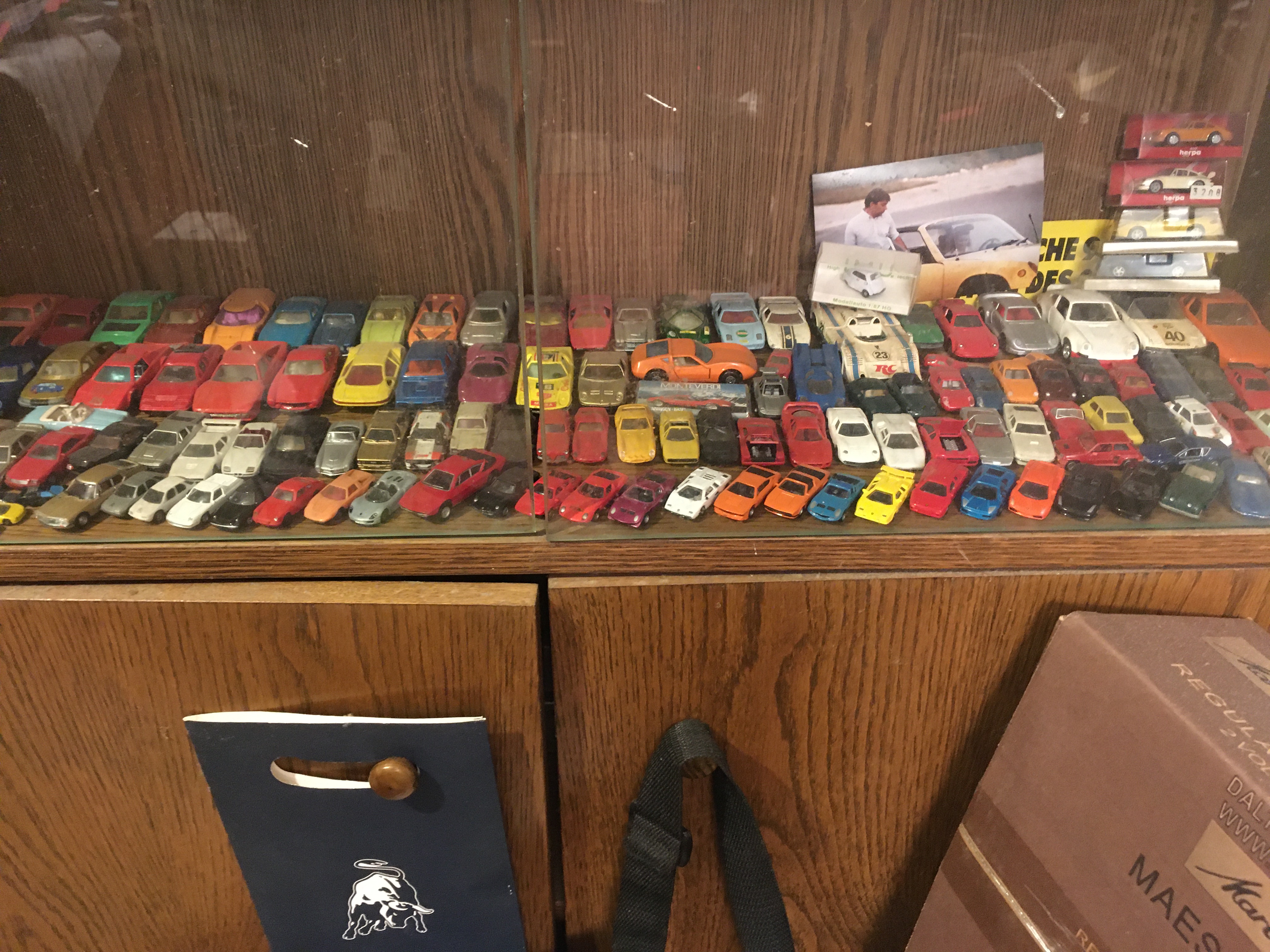 Vers la droite 2e rangée, on devine la Testa et la Diablo, rouges, de dos, capots ouverts, avec le moteur visible (87e Herpa).
