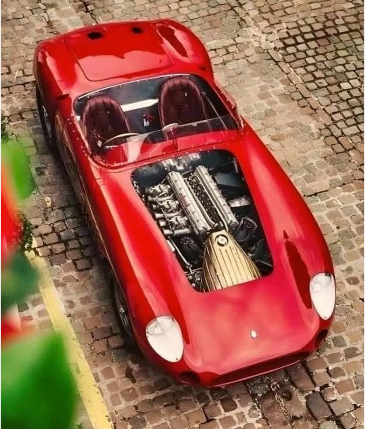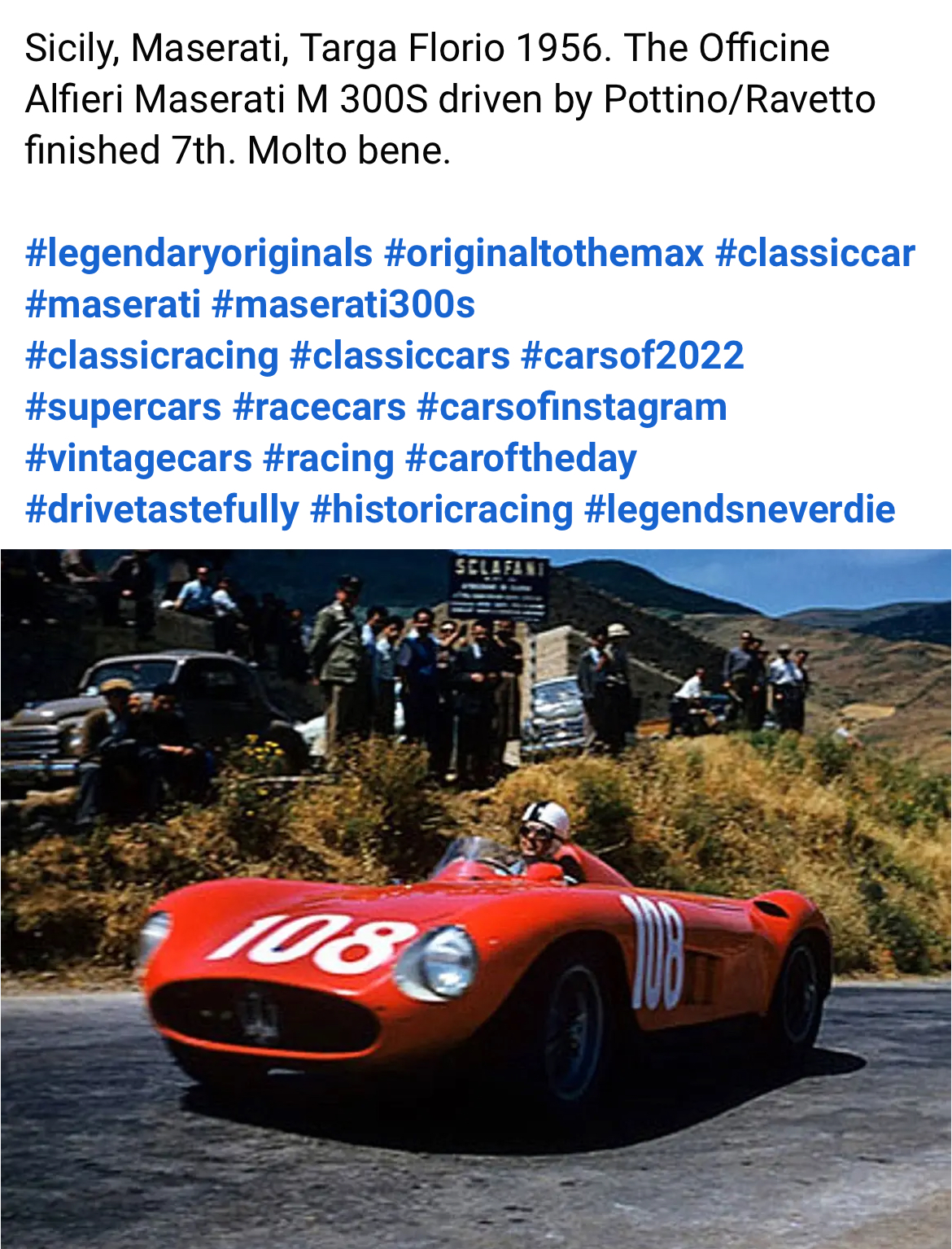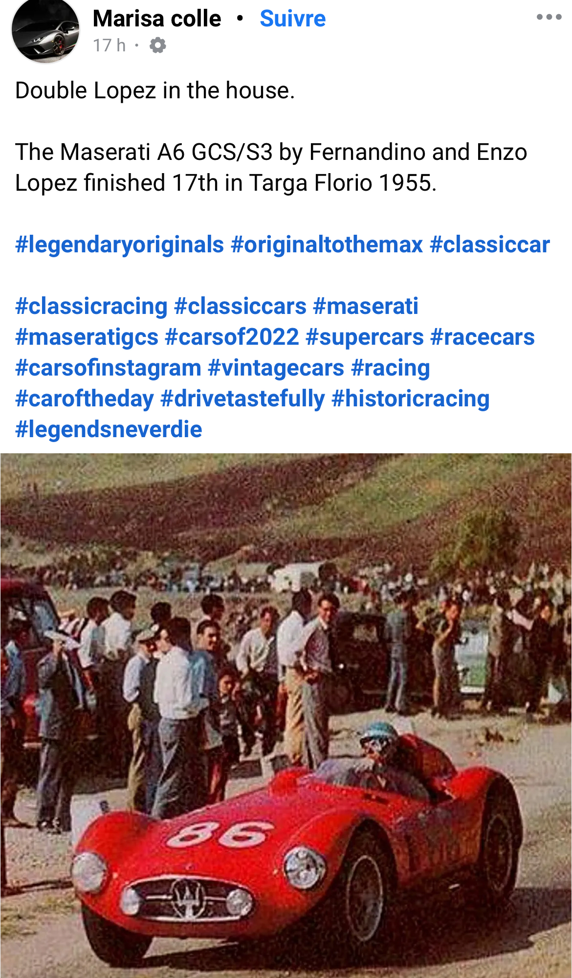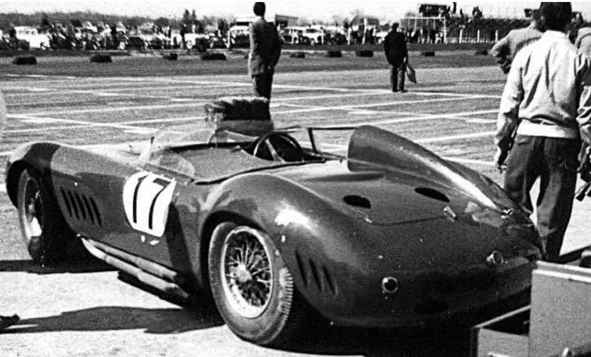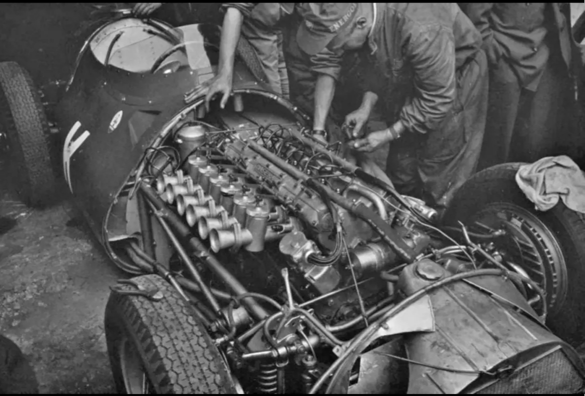 C’est la 250F de Stirling Moss à Spa 1956. Probablement Piero Taruffi aux cheveux blancs derrière.