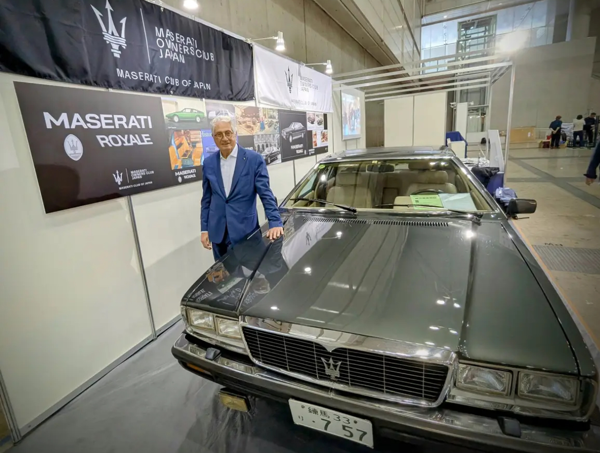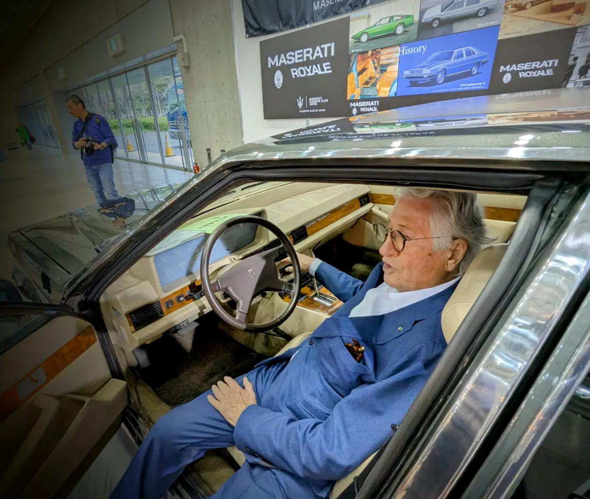 Photographies postées par Sinishi Ekko, président du Maserati Club Japan : Giorgetto Giugiaro, 86 ans, avec l’une de ses créations, l’une des 54 Quattroporte III Royale.