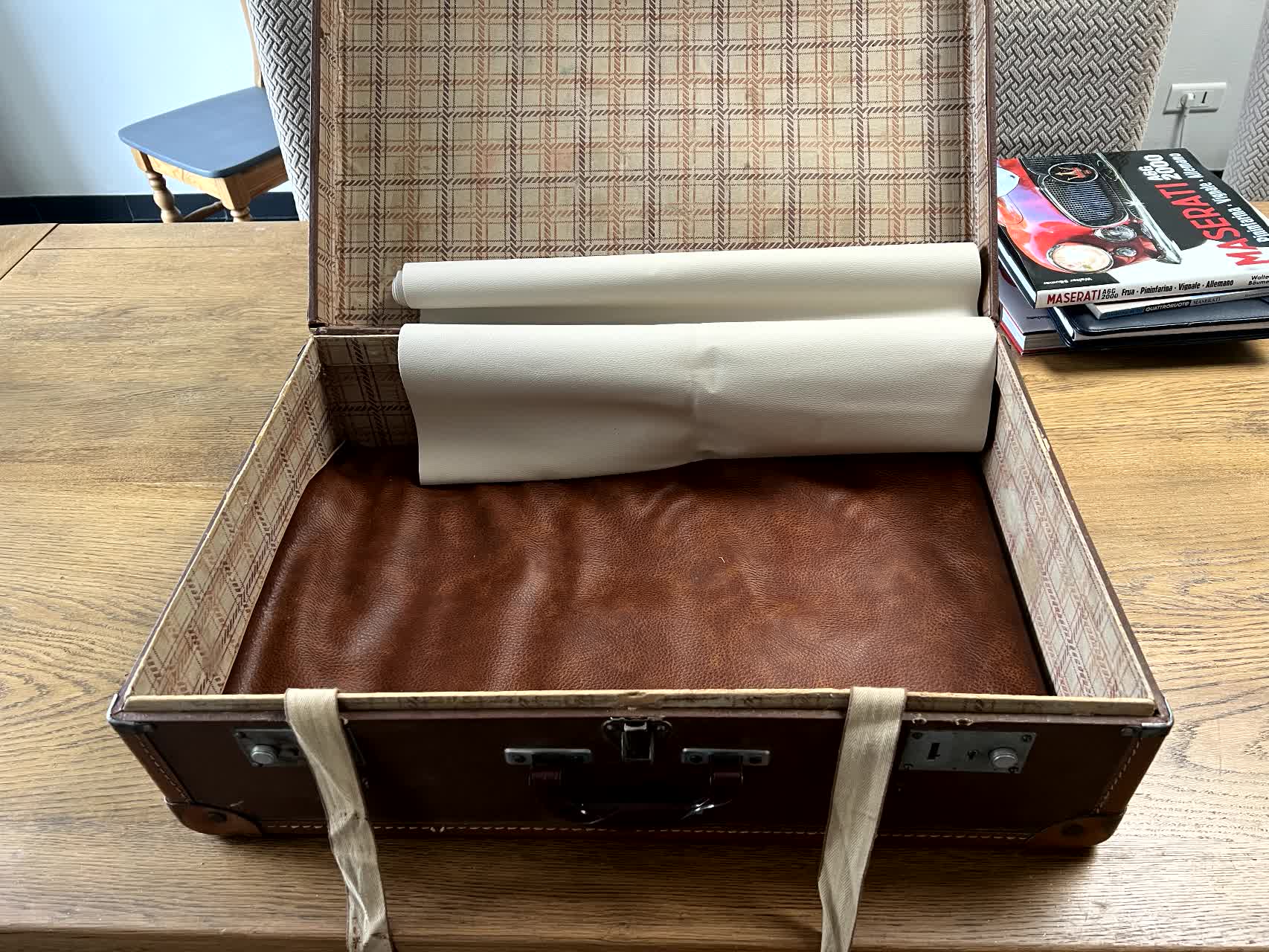 En premier lieu, trouver la valise. C'est fait, ca sera une bonne vieille valise en carton récupérée de l'arrière grand-mère paternelle de ma douce moitié.