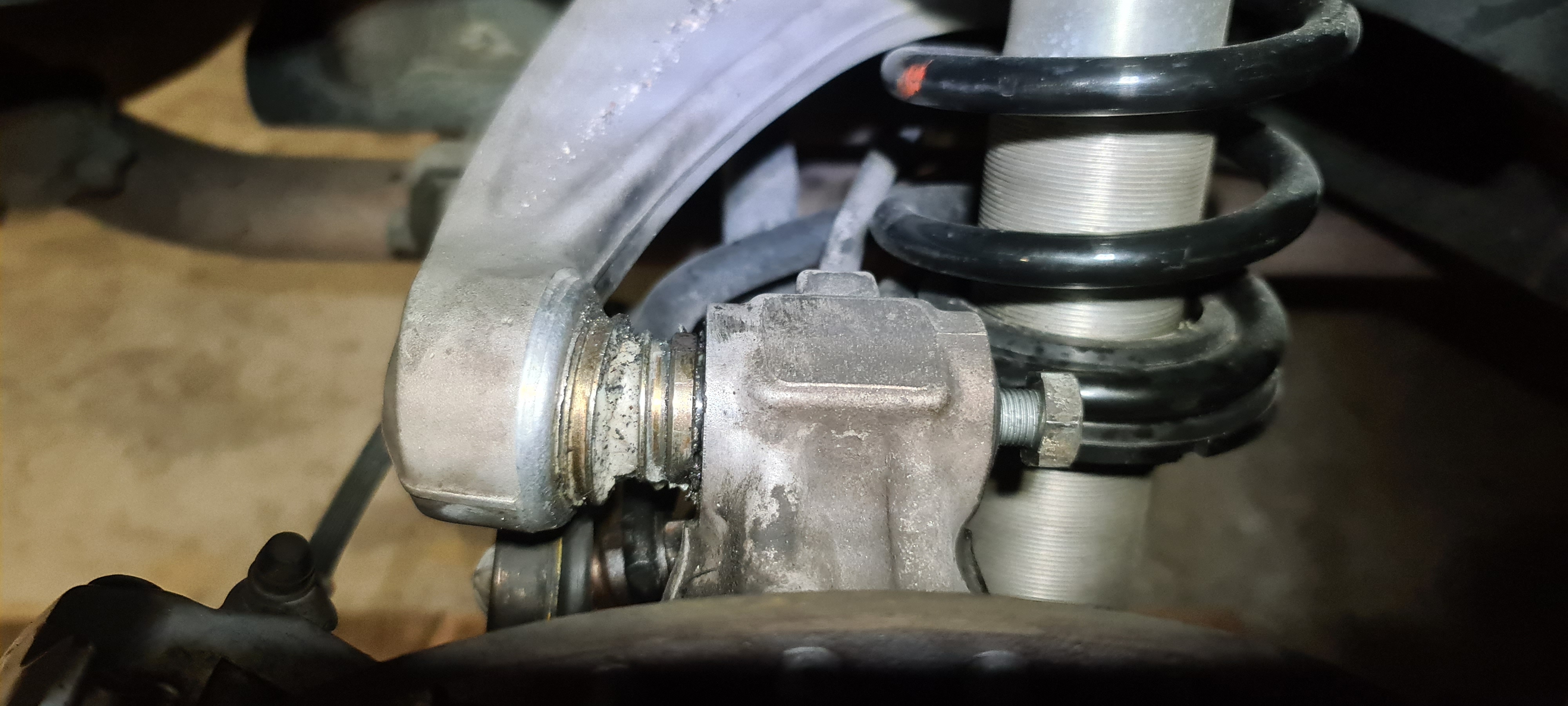 Il y a la durite rigide de frein qu'il faut dégrafé et bouger un peu pour gagner de la place et aussi le capteur abs. Ensuite tu peux placer un arrache rotule et après quelques tours de clef la rotule saute. Tu peux aussi faire sauter la rotule de direction pour être plus à l'aise lors du démontage.