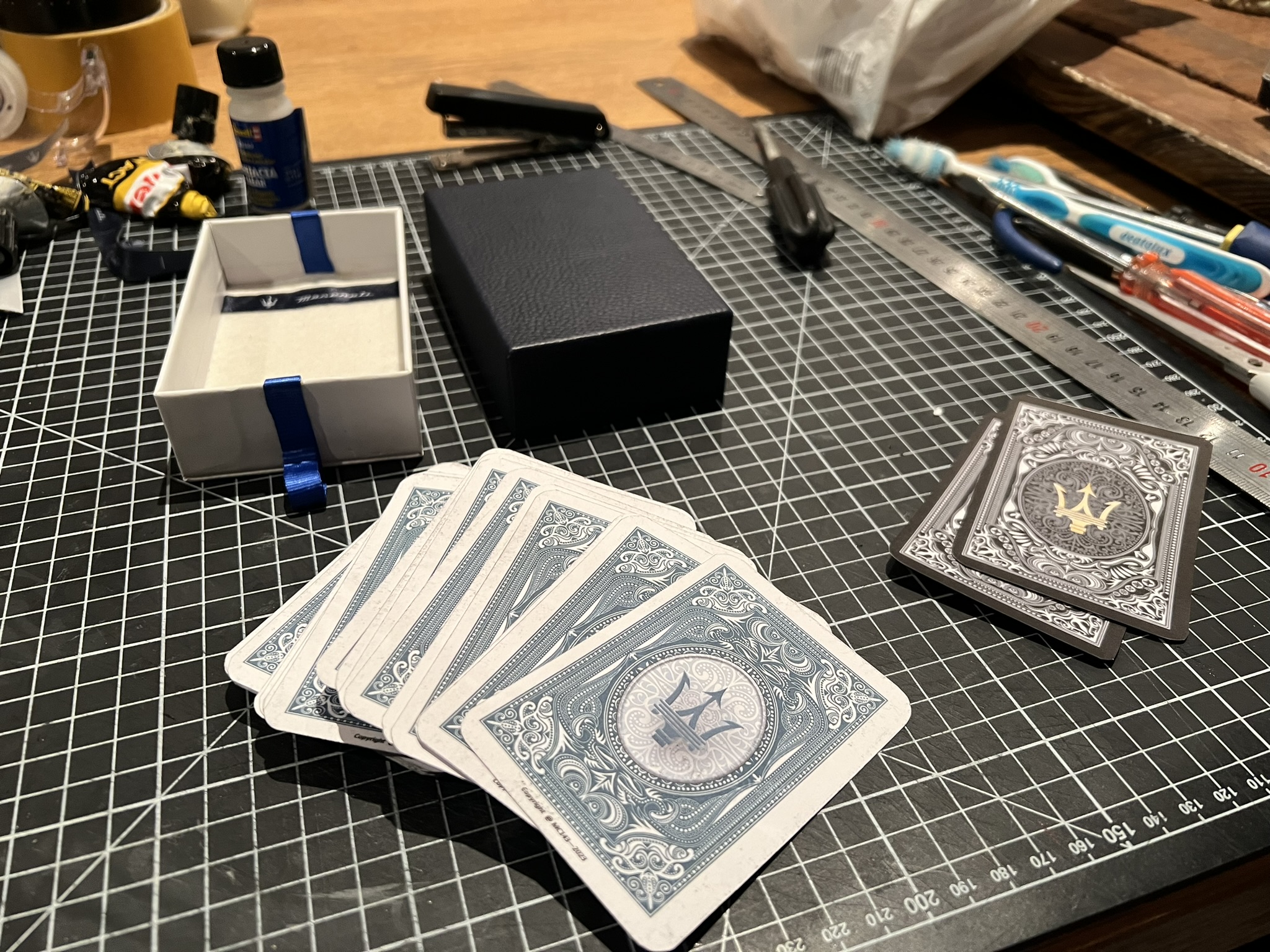 Du coup je l'ai ressorti et suis allé au bout du truc, avec 7 familles de 6 autos et 4 carte atouts. J'ai crée, imprimé coupé les cartes et j'ai fait une jolie boîte pour emballer le tout.