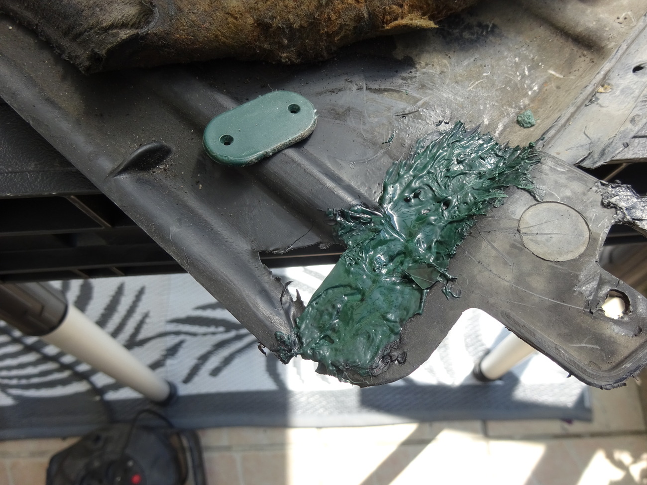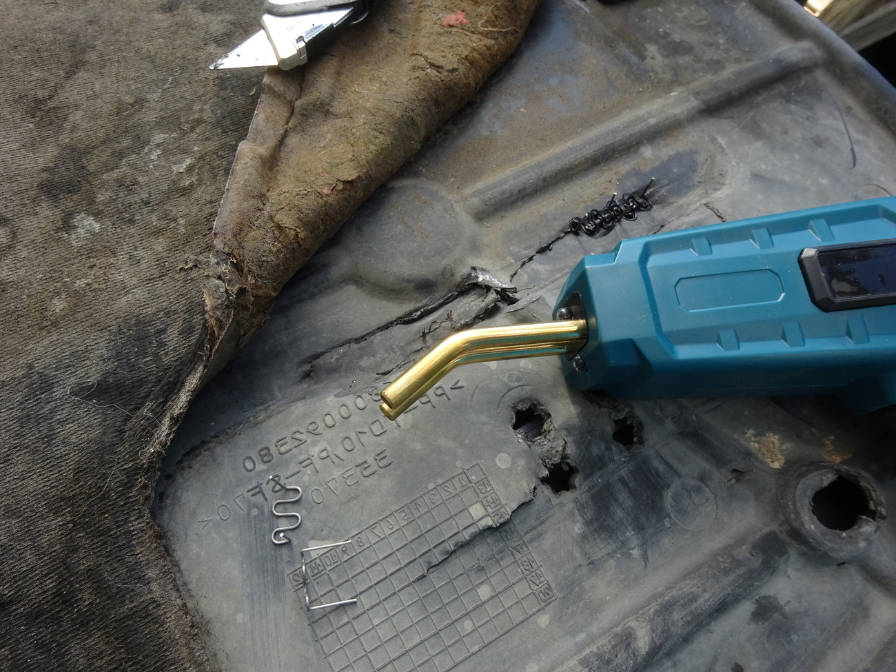 une patte de fixation au niveau de la boîte complètement tordue la voiture est défoncée dessous il y a même des trous en étoiles dans le cache les têtes de vis de berceau . Enfin voilà quelques agraffes avec l'agraffeuse thermique , rebouchage avec les moyens du bord bout de plastiques et fer à souder souflant c'est pas beau mais ça tient j'attends les aggraffes en U perdues pour remonter tout ça