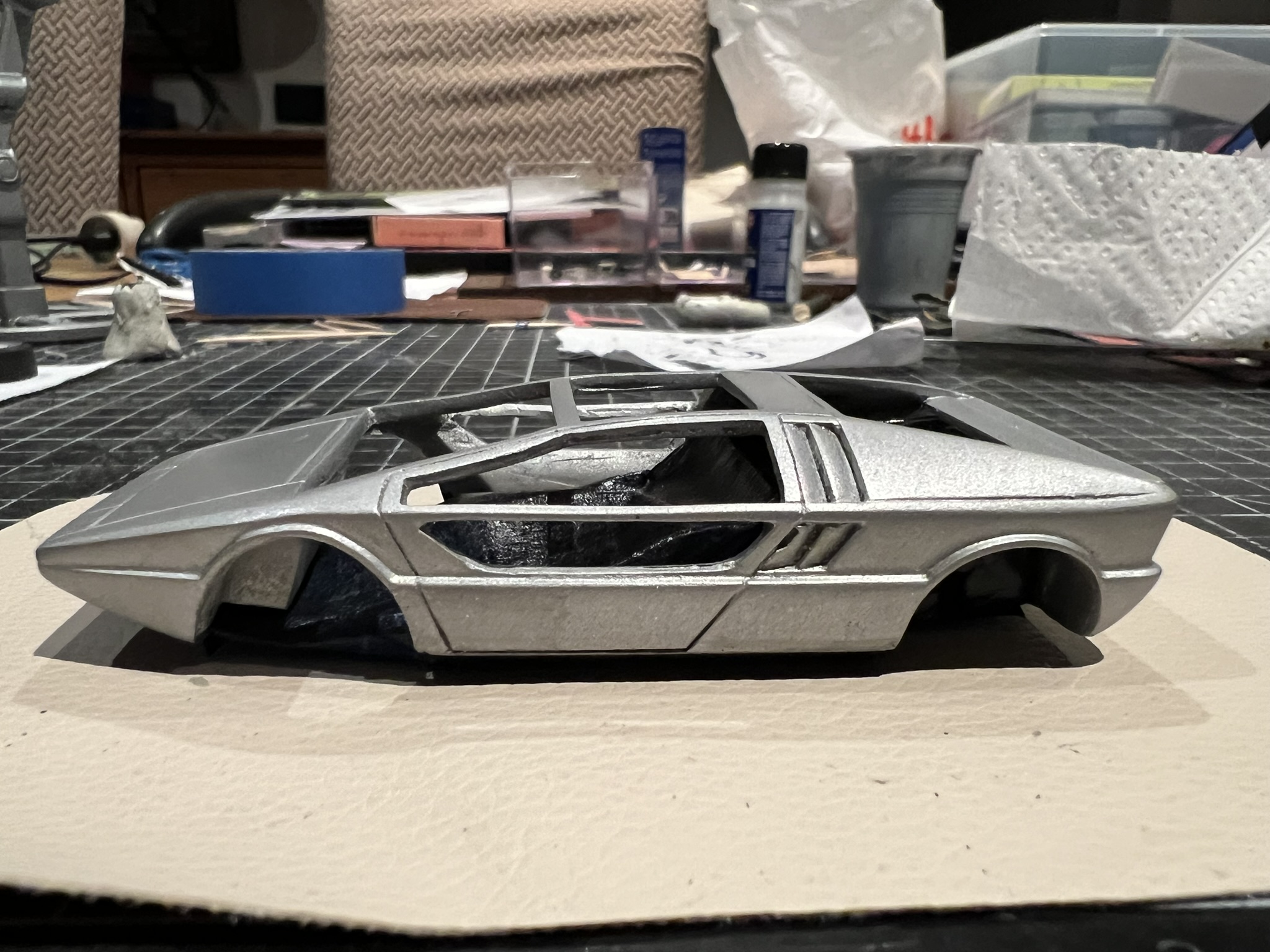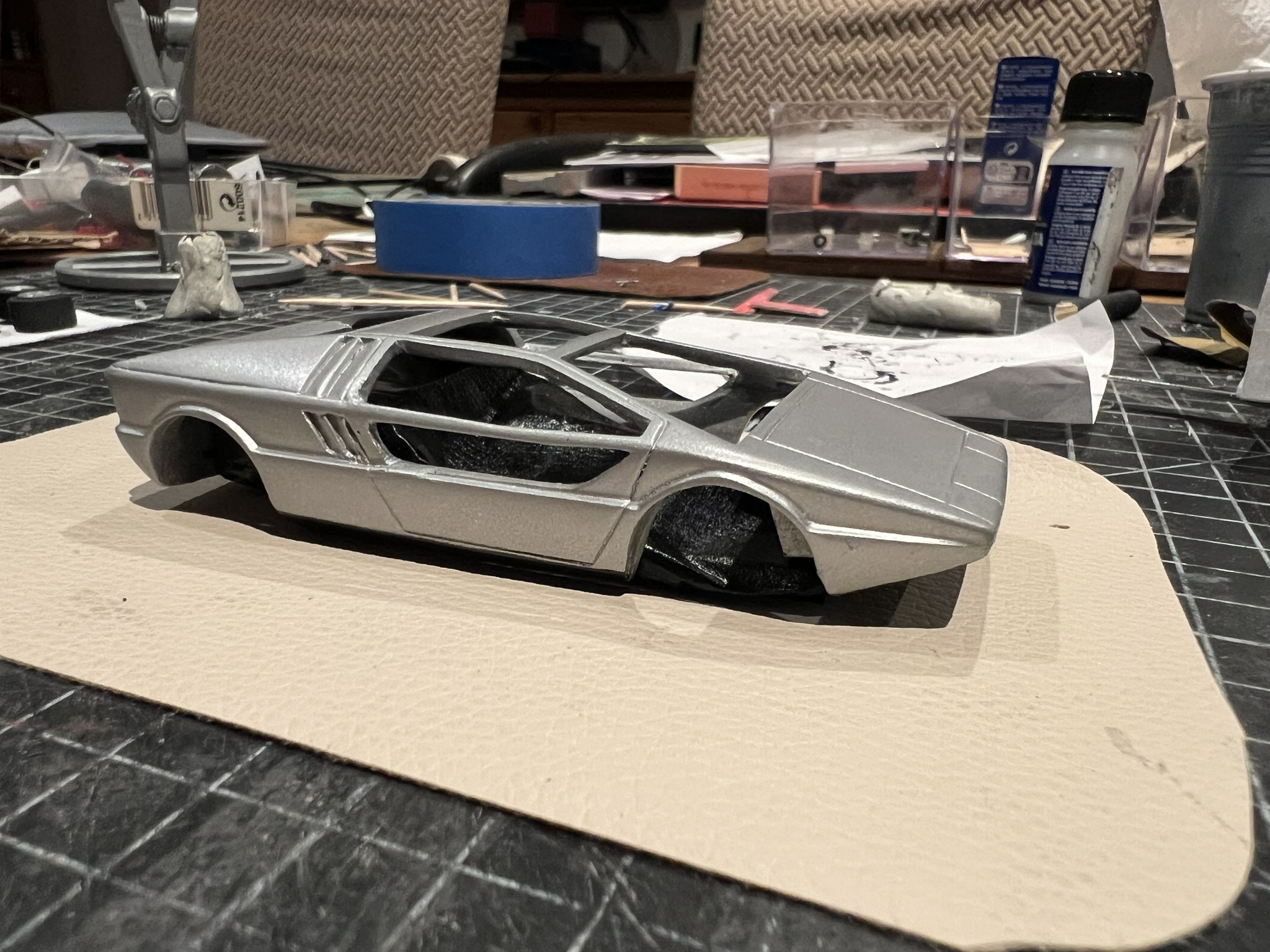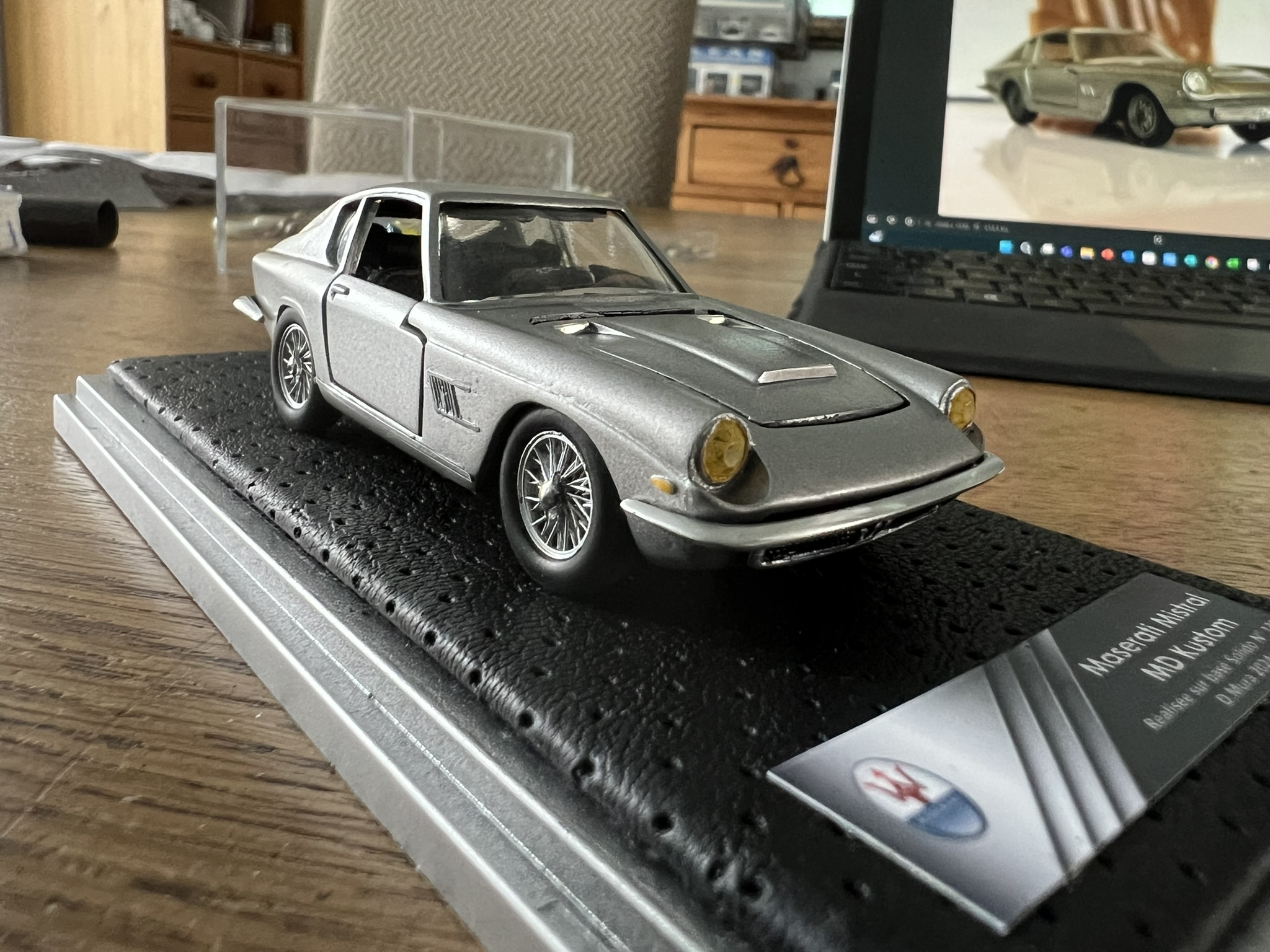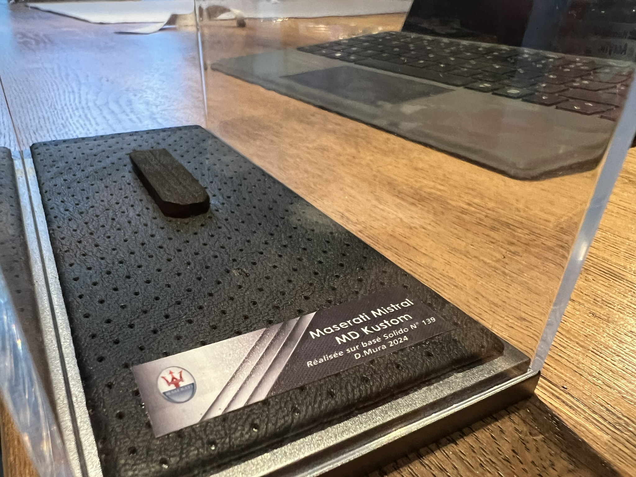 Restera à reprendre les détails à peindre (clignotants, feux, grilles d'aération, baguettes de carrosserie,...) et puis ça sera le montage dans une belle boîte spécialement réalisée (à partir d'une boite Kess) en y ajoutant un support souple sur une plateforme en cuir perforé et une belle étiquette.