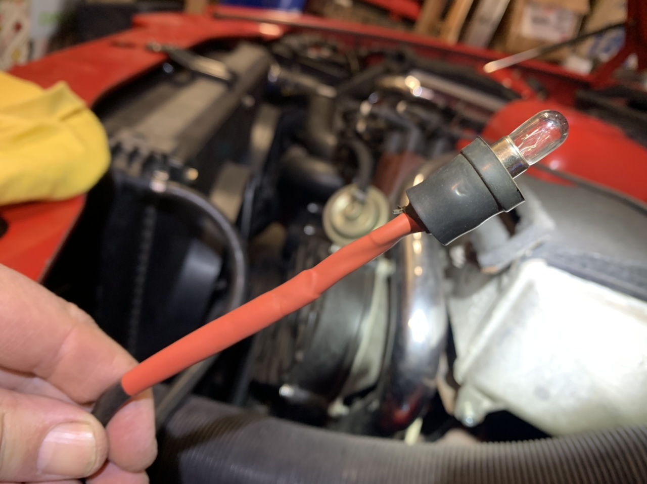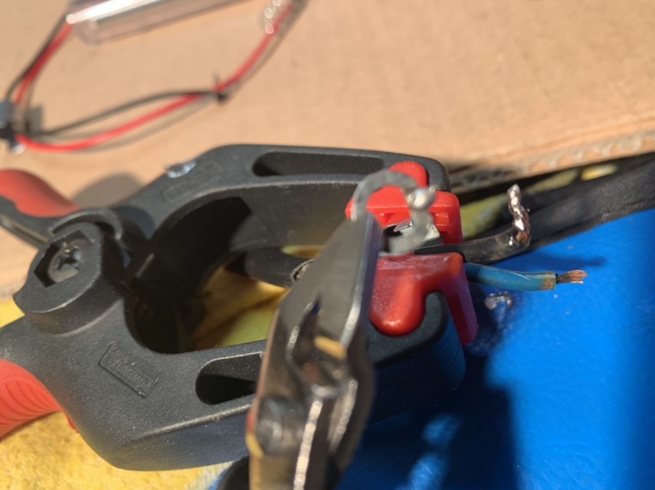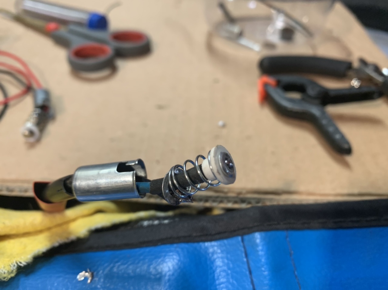 Bref, il faut partir de ça en bas, pour arriver à ça en haut. Le mieux est de faire passer le brin de câble par l œilleton, en débranchant la canalisation de lave glace pour avoir plus de place pour passer. On coupe les fils. On passe de la gaine rétractable pour l étanchéité. On passe la douille. On soude la petite collerette. Puis on met le ressort, la petite gaine rétractable pour protéger le plot. Comme on ne peut récupérer celui qui vient avec la douille, on utilise un rivet qui va faire un plot très acceptable. On sertit le câble dénudé dans le rivet, on soude l extrémité ça ne peut pas faire de mal.