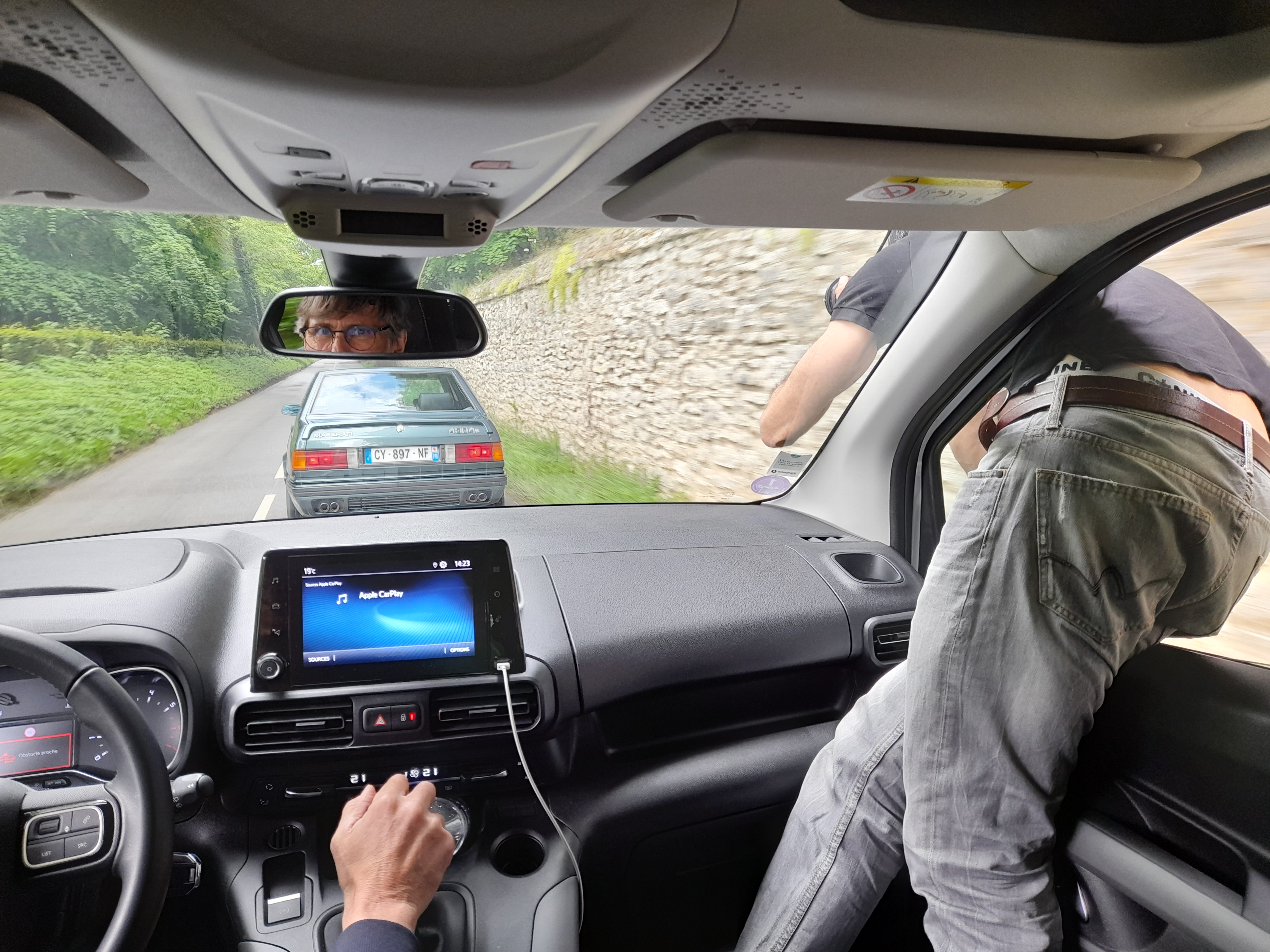 Le photographe à moitié dehors et le chauffeur qui regarde derrière.