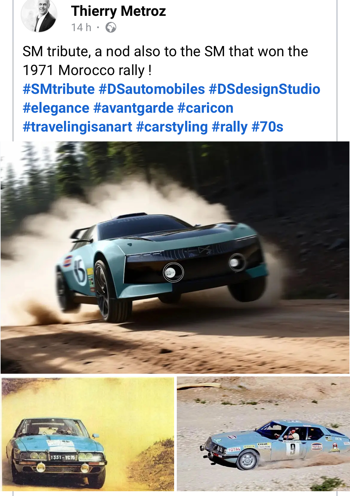Thierry Metroz, le chef du design DS et responsable du projet SM Tribute, a posté une SM Tribute évoquant la victoire de la SM au redoutable rallye du Maoc 1971 :