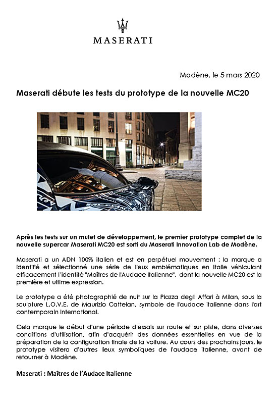Longue vie à cette MC20 qui sera présentée à Modène, "a casa", très prochainement fin mai 2020.