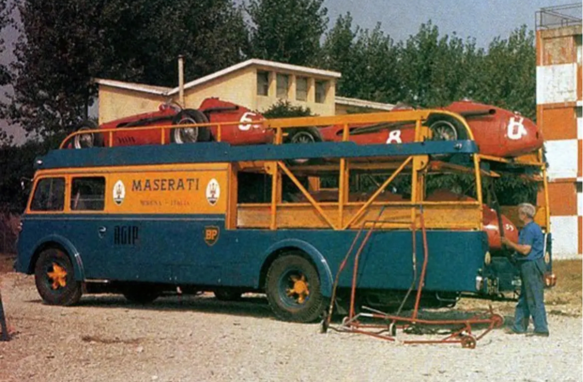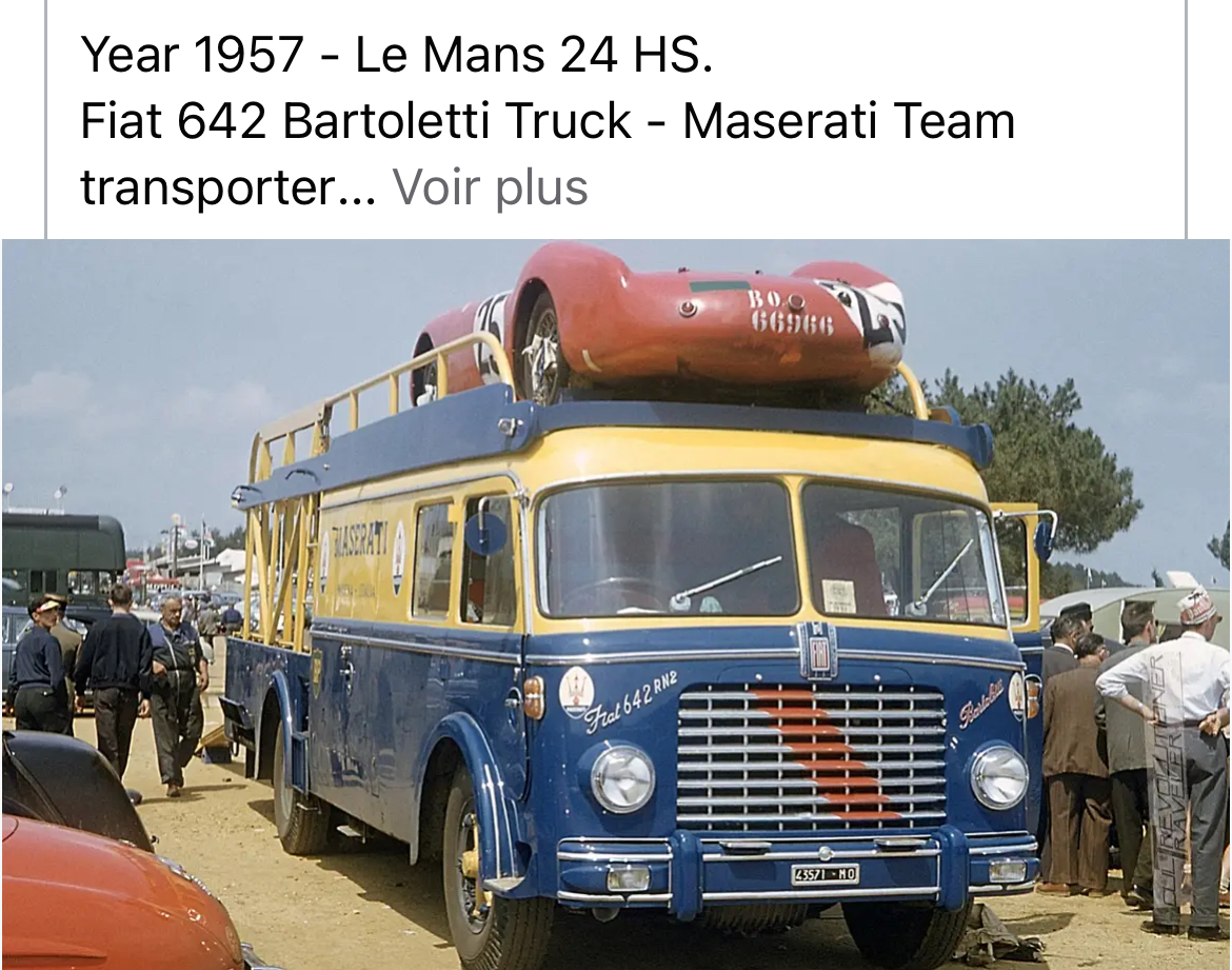Ayant fait l'acquisition du modèle au 1/43, je me repenche sur une des photos les plus célèbres de transporteurs Maserati, que j'ai cherché à localiser :