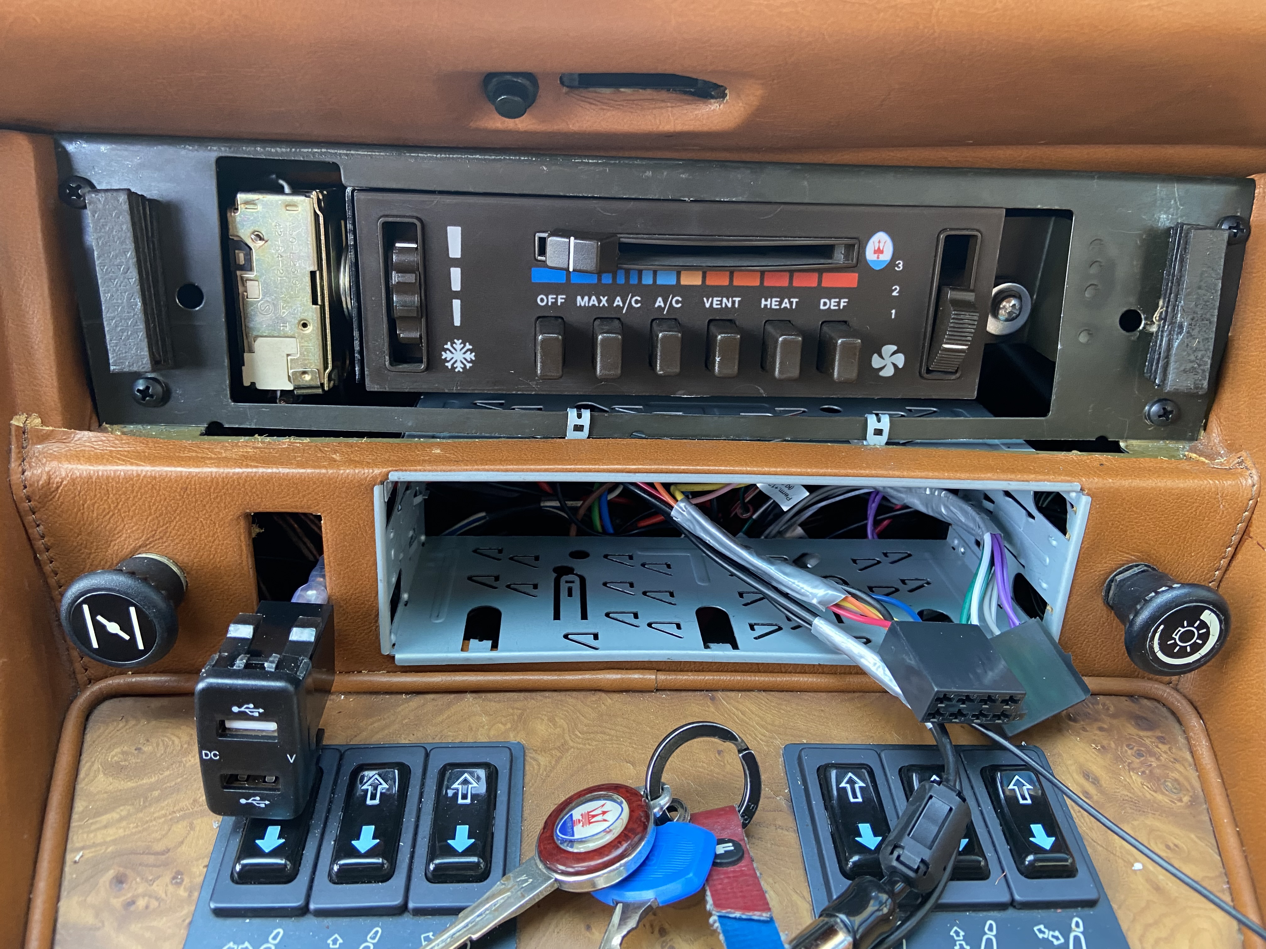 Enfin, l’antenne d’origine, cassée, est remplacée par une réplique Retrosound Mini Electric Automatic Antenna PA-03B (le challenge ici est que la trappe d’antenne ne permet pas l’installation d’un modèle standard, trop long), combinée à un amplificateur d’ondes pour le DAB.