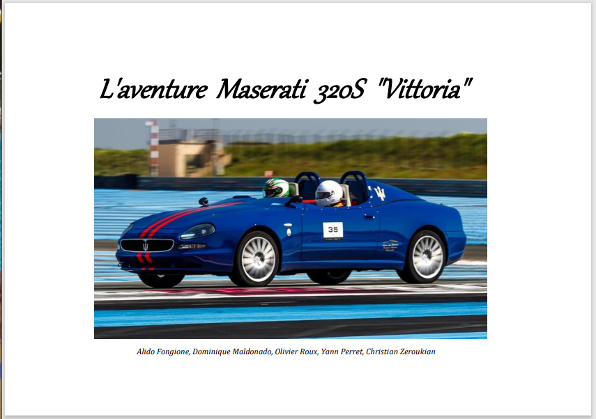 nous avons le plaisir de vous annoncer la sortie d'un nouveau livre Maseratitude racontant toute l'histoire de la 320S Vittoria, depuis l'élaboration du projet, son rapatriement depuis l'Angleterre (volant à droite oblige comme les barquettes S des années 50), sa transformation en barquette au lycée Mistral de Marseille, ses salons avec son parrain et sa marraine (François Allain de Vintage Mecanic et Fabia Maserati petite fille d'Ernesto) qui signent sa planche de bord, ses premières sorties au circuit Paul Ricard ...