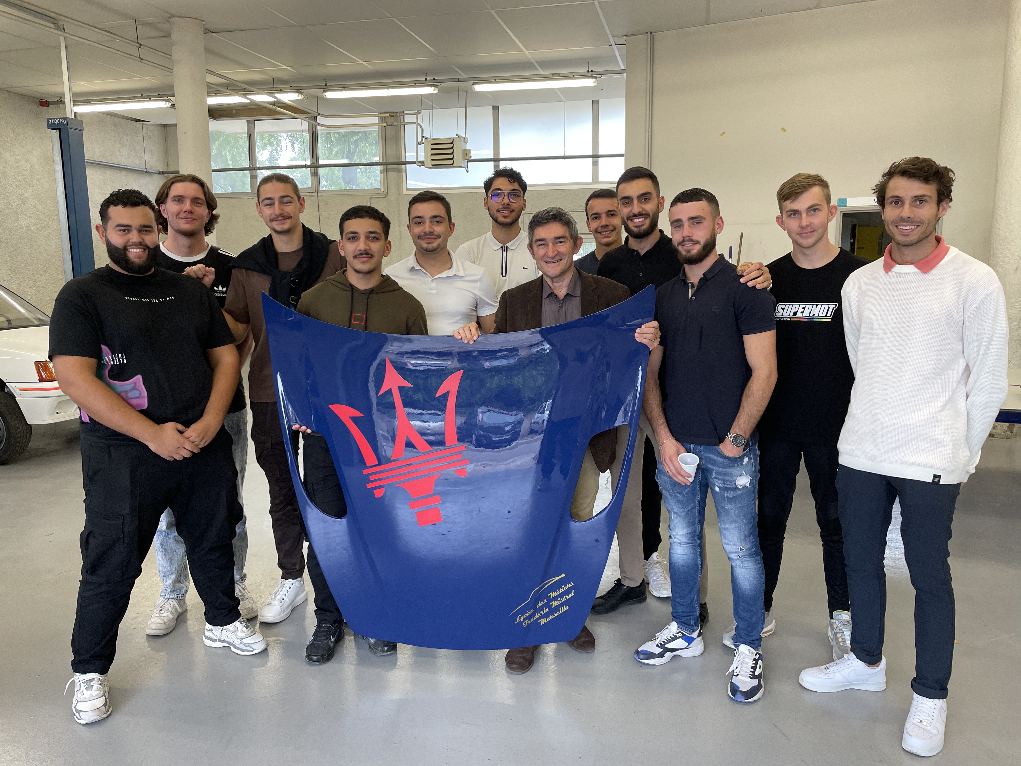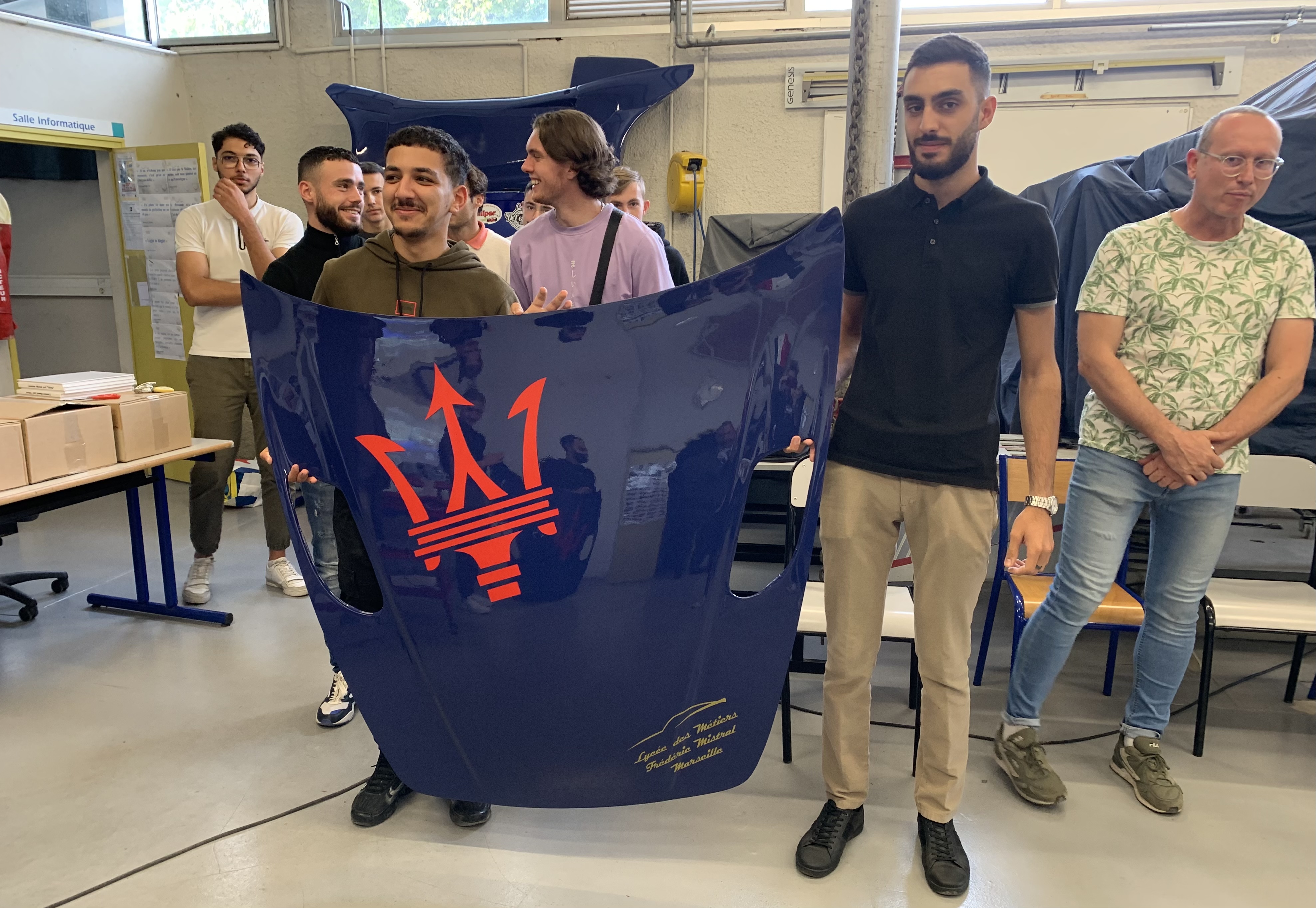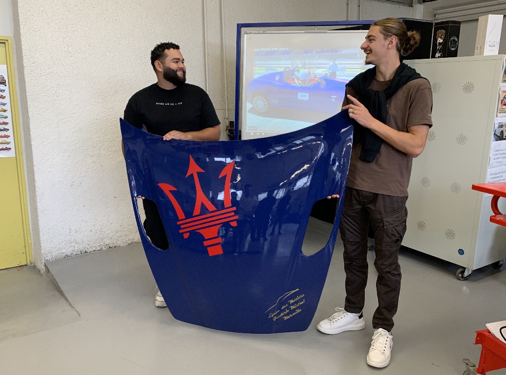 (photos Domi) Un magnifique capot de 3200GT chacun, aux couleurs de Vittoria, en résine, avec le trident et la signature du lycée Mistral ! Grande émotion !