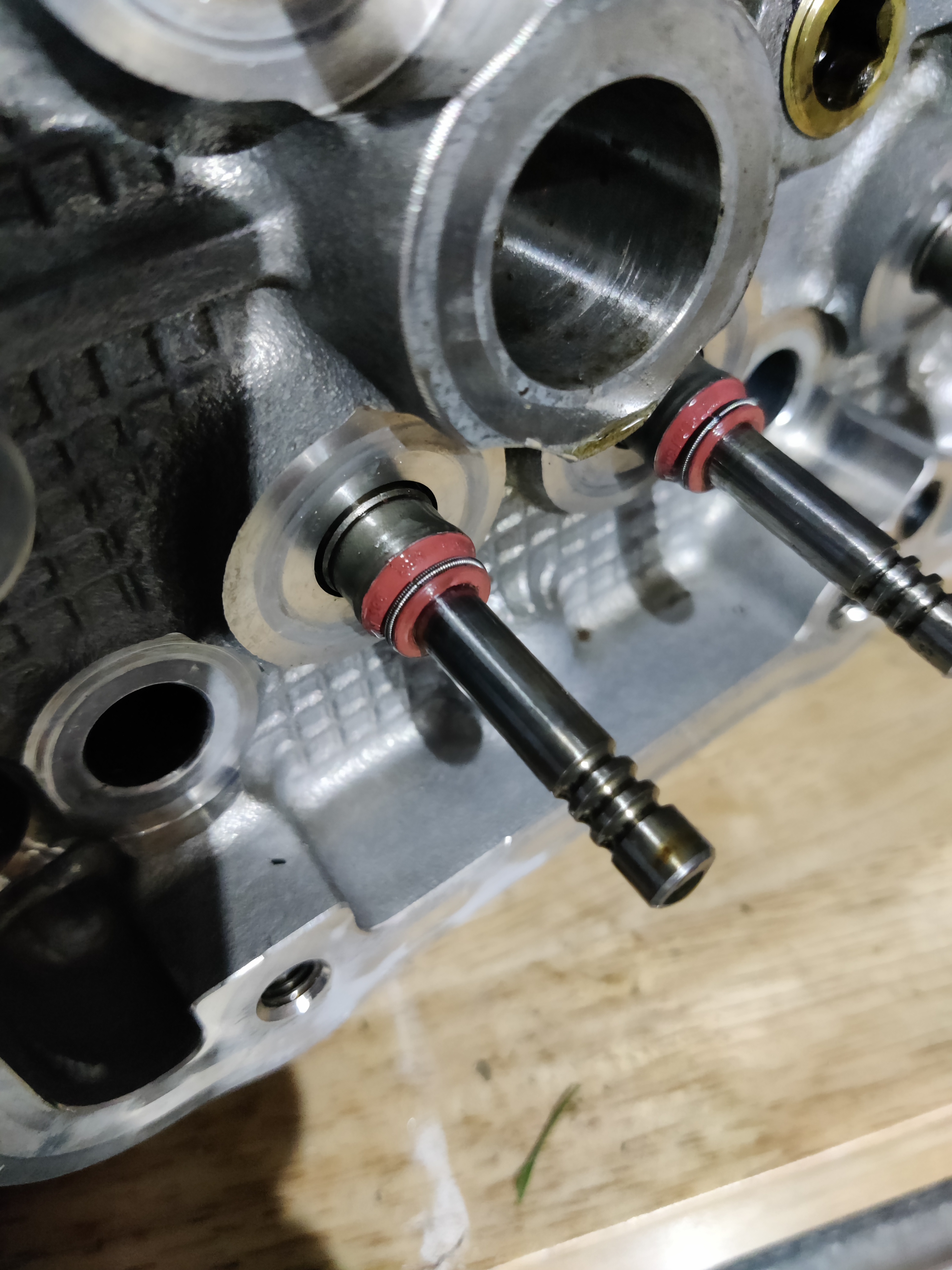 Pour remettre les neufs, c'est bien plus simple, on huile la queue de la soupape que l'on remet en place, idem pour le joint (s'agirait pas l'abimer en l'emmanchant sur la queue de la soupape, il parait que les stries peuvent abimer le caoutchouc), on insère à la main le joint sur son support, et on termine en donnant quelque coup pour l'enfoncer (j'ai utilisé une douille de 12 qui prenait appui sur la partie métallique du joint, ça marche bien). Le joint se compose du caoutchouc rouge, d'un petit ressort qui permet de garder cette zone étroitement en contact avec la soupape (j'imagine) et d'une partie en métal qui vient s'insérer sur la tête du guide de soupape.