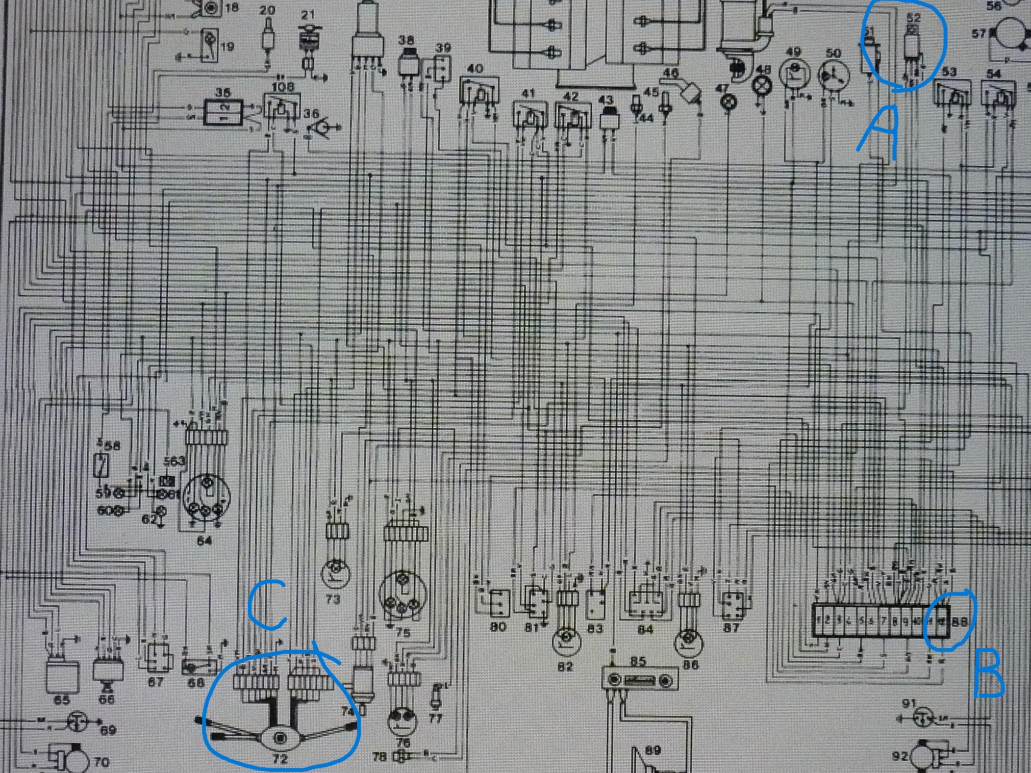 Le diagramme électrique de l'Indy 4900 nécessite des yeux de lynx, la centrale clignotante est la pièce 52 (en A), le fusible qui la protège est le n°12 en B, et le commodo est en C, ces trois composants étant reliés dans le diagramme: