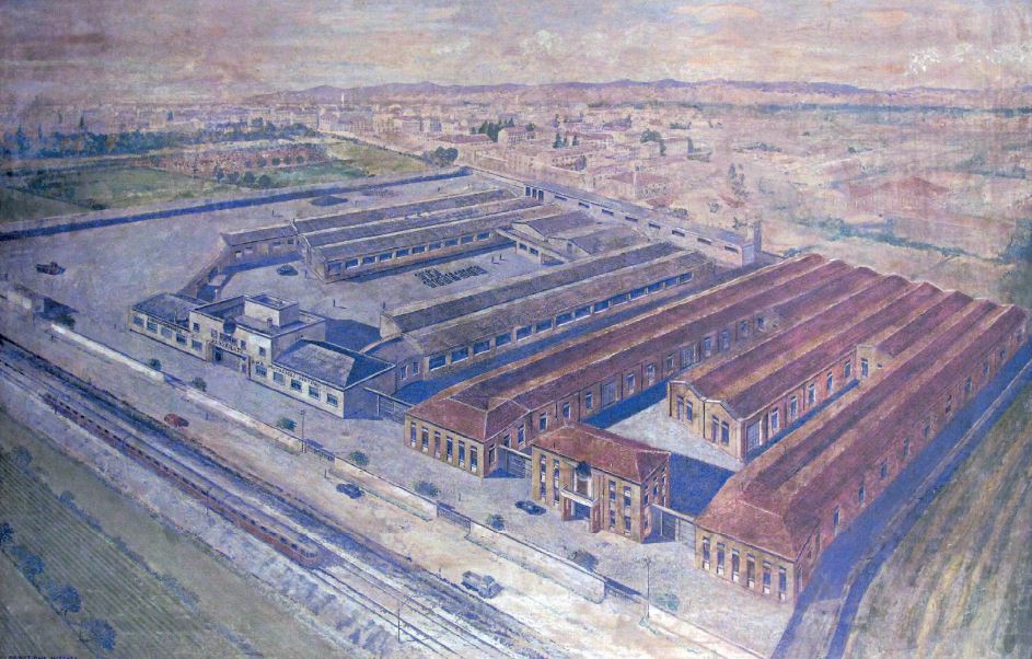 On voit clairement l'usine sur ce poster des années 50, ainsi qu'en bas ce qui semble être la ligne des productions Maserati de l'époque = à gauche un autocarro elettrico, une A6 1500, une moto et peut-être à droite un Muletto ?