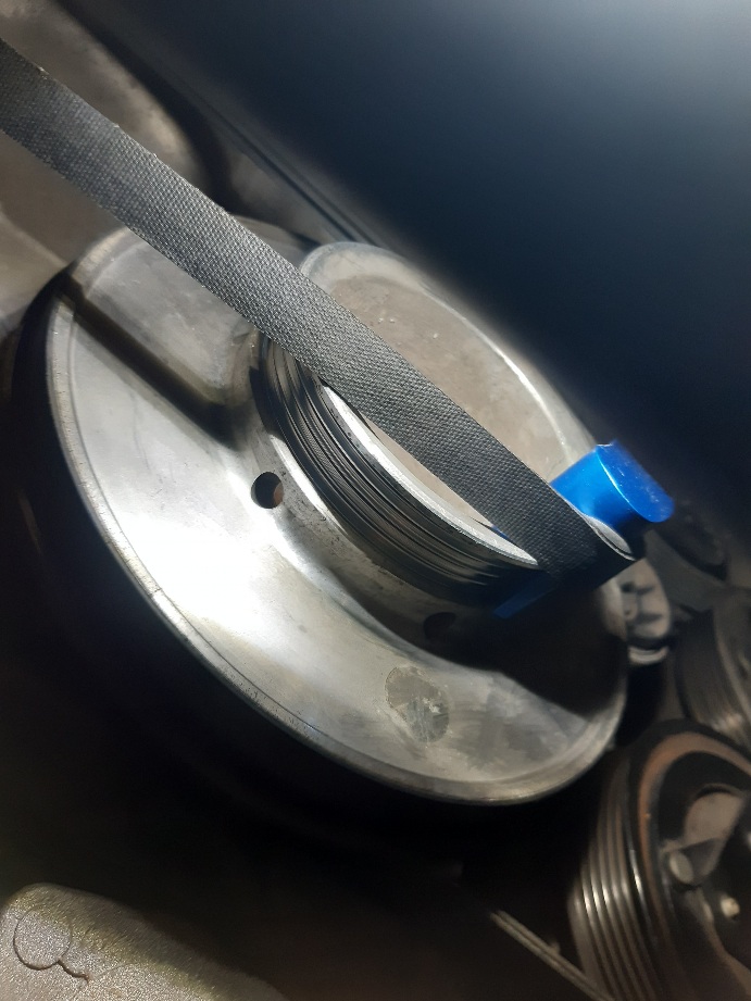 Ici je me suis arrêté à mi-chemin pour prendre la photo. La grande courroie c'est un jeu d'enfant aussi car avec le tendeur de courroie automatique on est sur que la courroie est tendu comme il faut. (Comme un string quoi