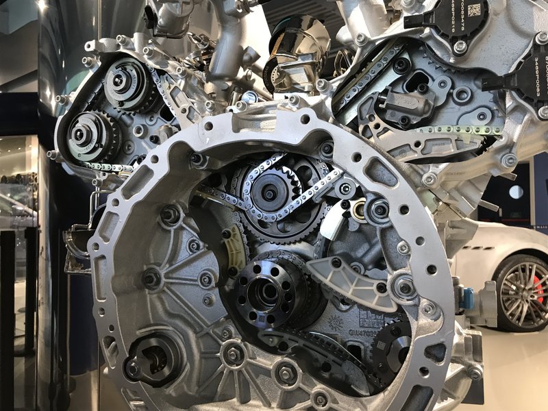 Le V6 semble très compact, très bas et très avancé vers l’habitacle. Voici ci-dessous des images de ce moteur V6 ouvert à 90 degrés, les deux turbos sont sur les côtés, tout cela comme sur nos vieilles Biturbo chéries de l’autre millénaire qui étaient vraiment prémonitoires ! Mais le fameux Y de l’arrivée vers la chambre d’admission après les échangeurs se fait par l’arrière. Il est symbolisé ci-dessous en jaune : Distribution par chaînes, variateurs d'arbres à cames sur l'admission et l'échappement, c'est une œuvre d'art, ce moteur : Mais le bouquet, c’est la préchambre de combustion, une technologie de Formule 1 appliquée pour la première fois sur une voiture de tourisme sur la Maserati MC20 ! Eh oui, avant Ferrari ! Deux bougies par cylindre, une latérale assurant la combustion normale, une centrale allumant une préchambre tubulaire en alliage doré : En usage tranquille, seule la bougie latérale s'allume. En moyenne et forte charge, la seconde bougie s'allume aussi en haut de cette petite colonne de 1 cm3 dans la pièce dorée. C'est cette colonne, la préchambre de combustion. Le mélange air-essence s'y enflamme et descend à vitesse énorme par trois sorties vers le cylindre (effet plasma) où il va entraîner une combustion hyper-complète et quasiment synchrone des gaz présents, gage de l'absence de cliquetis malgré un taux de compression à 11 : 1, valeur très élevée pour un moteur suralimenté. Notez la forme très travaillée du sommet du piston.