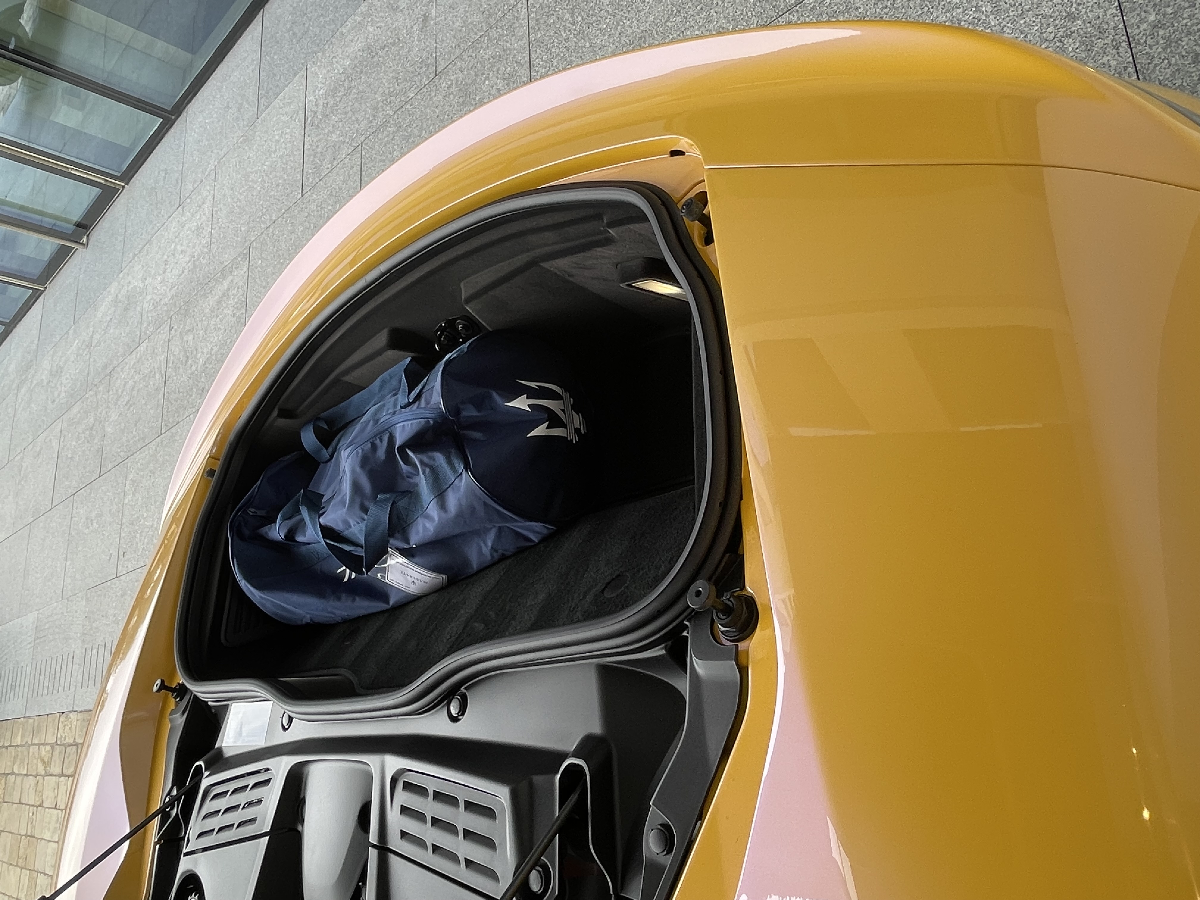 On accède grâce à l’ouverture d’un seul hayon au moteur central et au coffre en porte à faux. Chouette, on peut regarder le moteur (un peu car il est profond) chaque fois que l’on va chercher quelque chose dans le coffre, lequel avec ses 101 litres est juste suffisant pour un week-end à deux. Mais impossible d’y mettre les courses de chez Picard voire même des aliments ou des médicaments thermosensibles :