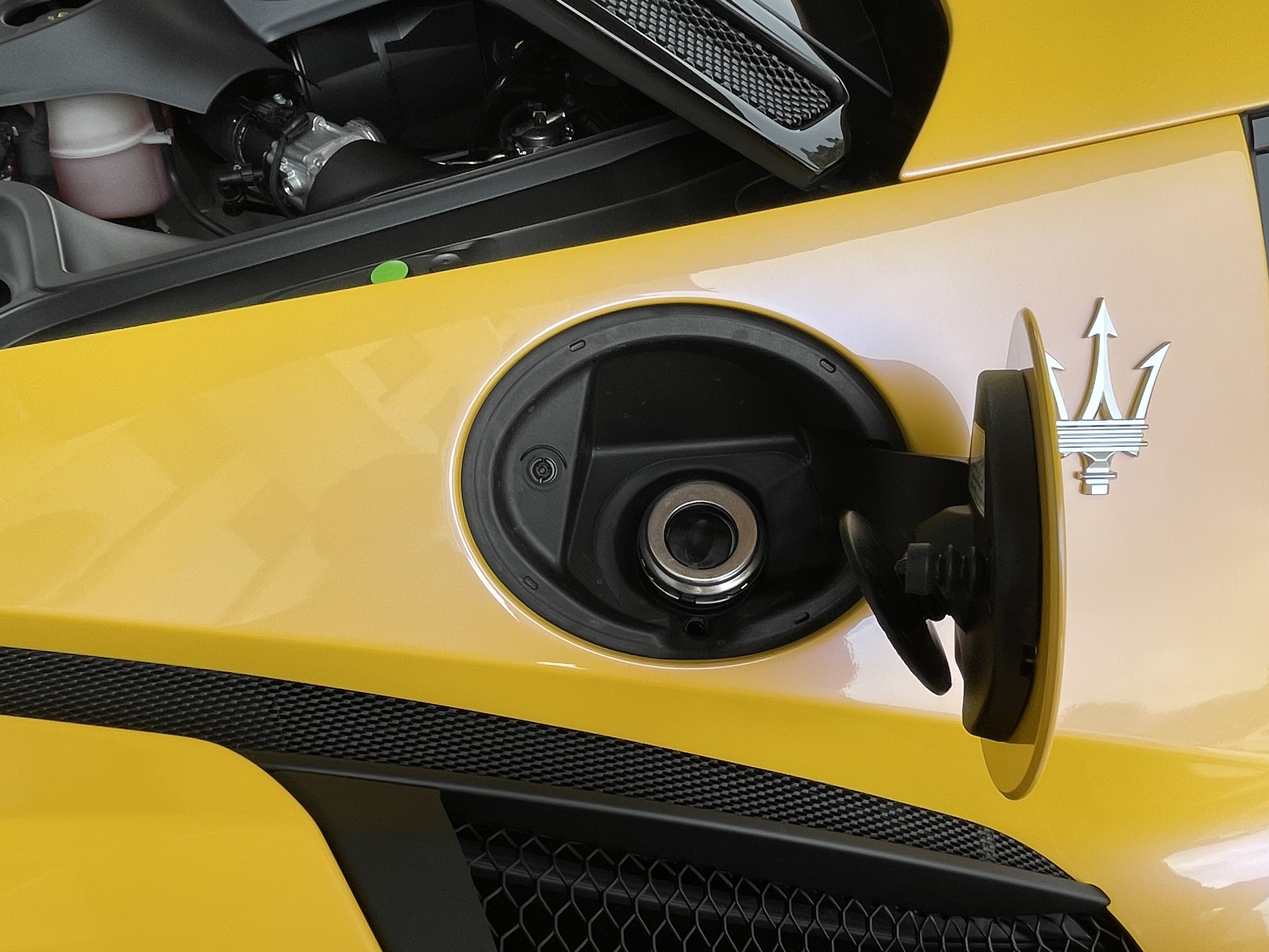 A l’avant un très petit coffre de 47 litres avec le pré-équipement pour brancher un maintient de charge qui est fourni (boite bleue siglée Maserati). Le bouchon bleu est celui du liquide lave-glace :