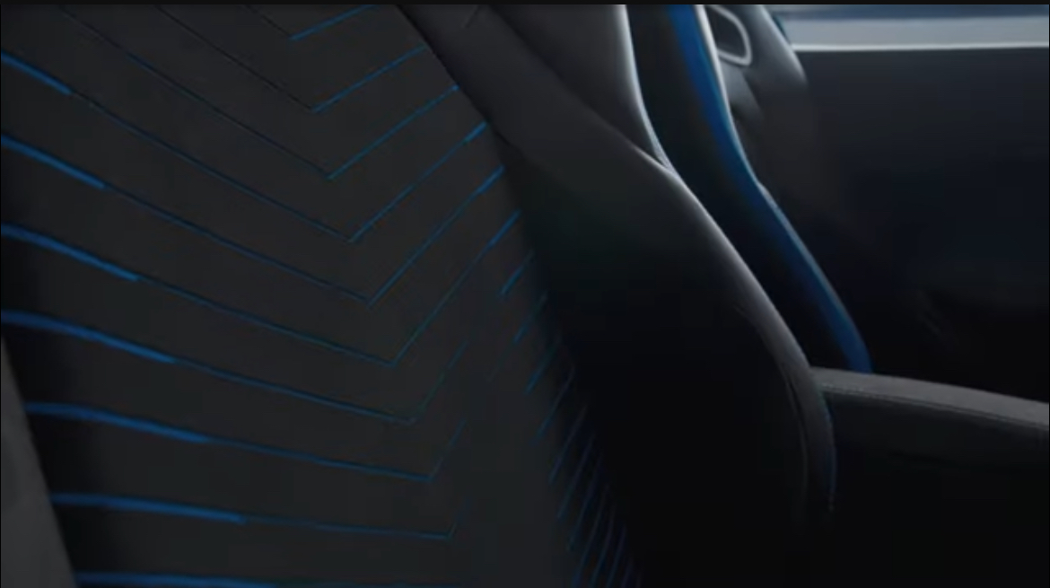 La signature Fuoriserie : Alcantara antidérapant strié de bleu au centre, cuir noir et bleu autour :