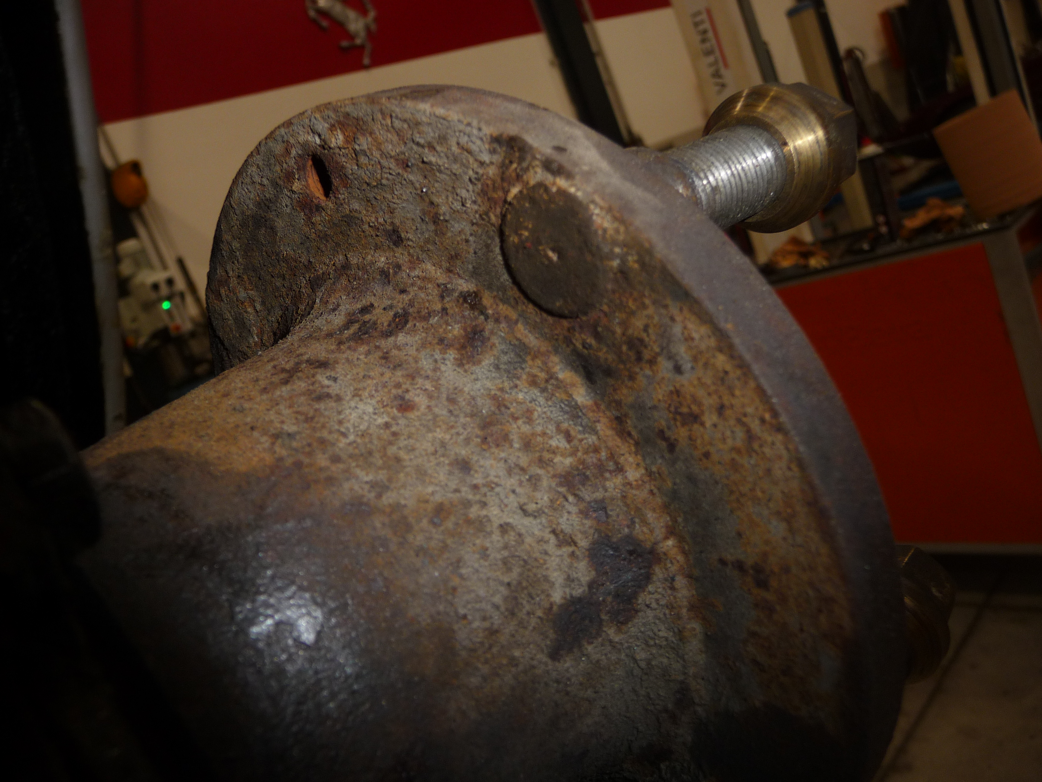 En grattant, on aperçoit que c'est tout rouillé mais on observe à l'aplomb du goujon une zone plus épaisse et on devine un cercle qui serait le débouchage du goujon: