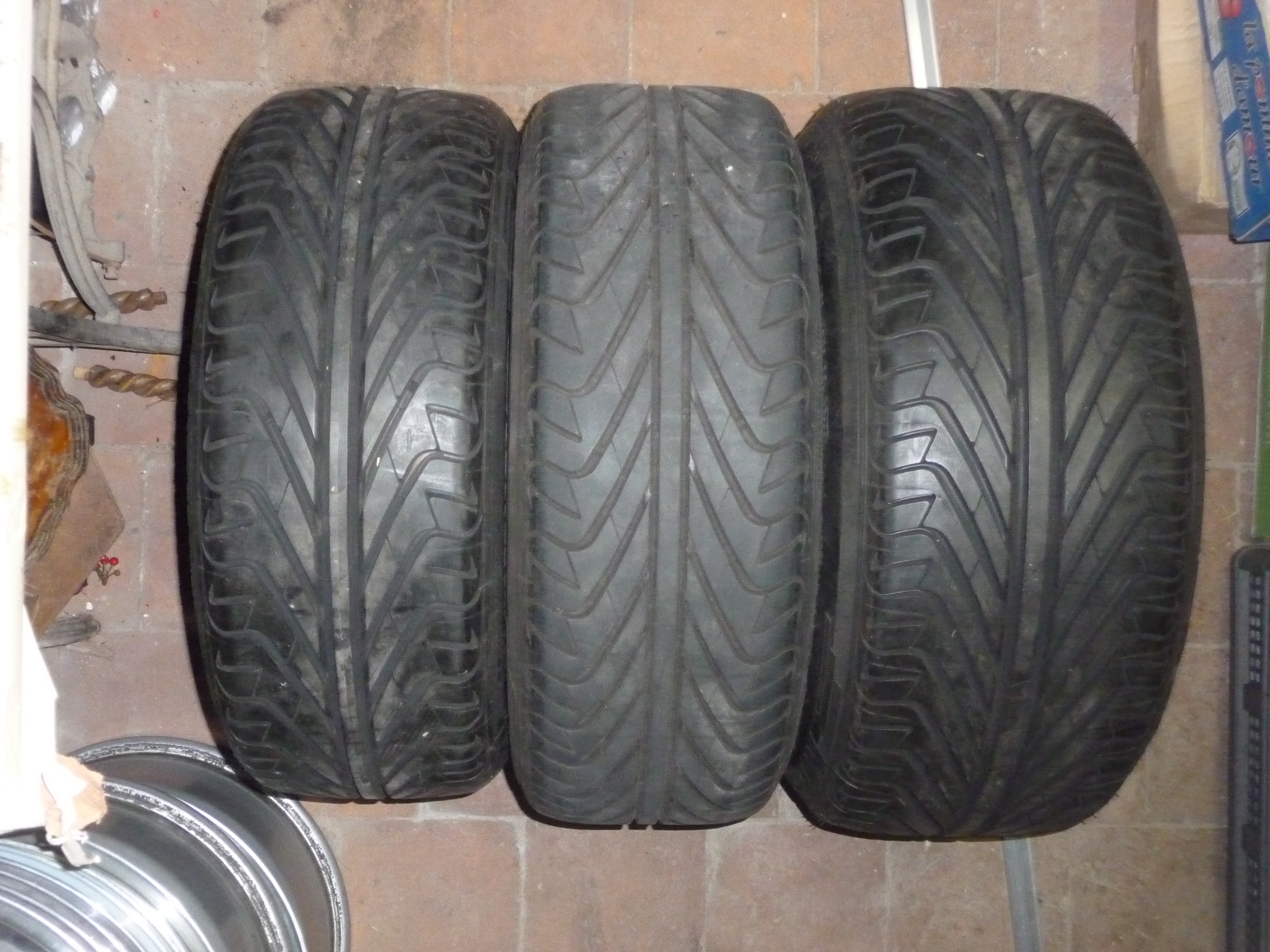 Bon, malheureusement les 225/55 ne sont pas tout jeunes (de 2001) et ont déjà vécu, alors que les autres sont de 2006 et quasiment "neufs" (du moins en ce qui concerne la profondeur des sculptures, pas l'âge), mais ils ne sont pas encore "lisses" et, d'après mon examen et mes essais, les pneus n'ont pas de fissures et ils tiennent encore le parquet sur le sec tant qu'on ne les sollicite pas trop.