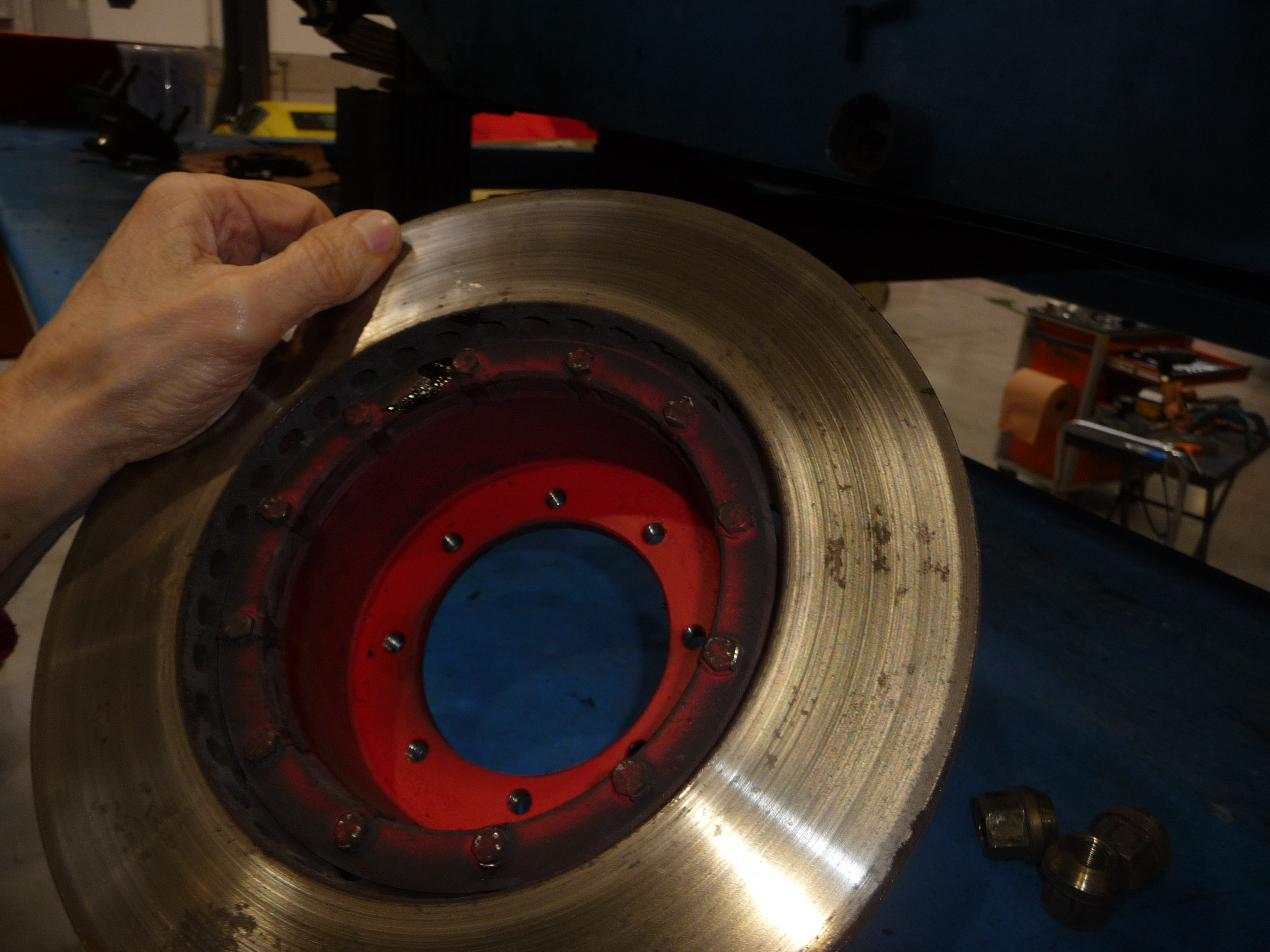 Heureusement, quand on regarde le cylindre du disque de freinage sur lequel se plaque et se visse le disque de moyeu, il y a 4 alésages correspondants en bord de cylindre (ici on en voit deux), à l'aplomb des 4 goujons et suffisants pour éviter le conflit lors du serrage: