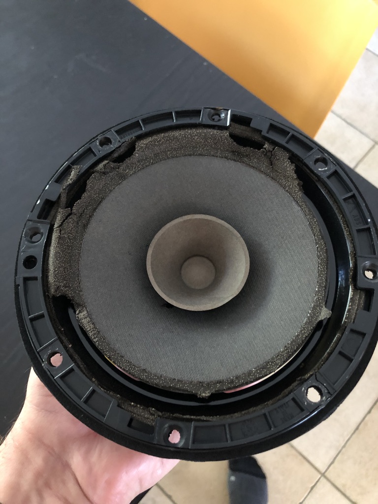 Mauvaise surprise après lancement de l'autoradio : son médiocre à droite. Après rapide vérification, j'ai trouvé la raison, toute simple : un HP avant à la membrane en train de se faire la malle