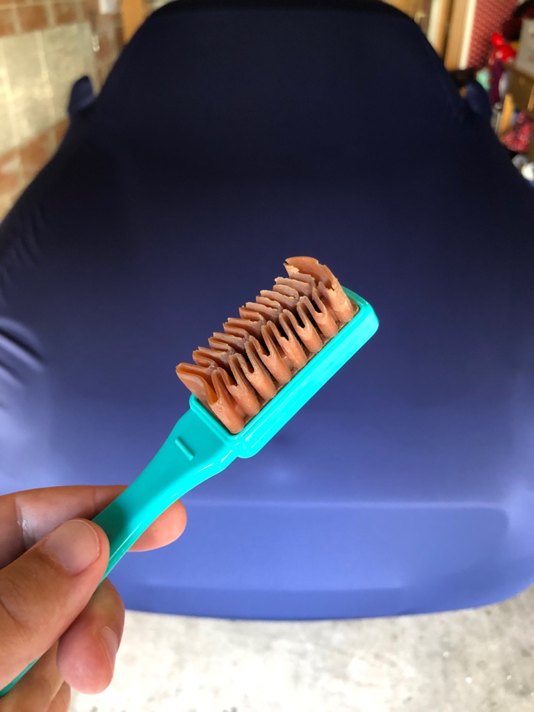 Parmi les autres bricoles réalisées, j'ai changé les centreurs de porte, qui étaient tout moches : Il fallait également remplacer la grosse durite devant le moteur, qui commençait à se fendre (et au passage qui avait déjà été réparée au chatterton). Ensuite, nettoyage moquette et brossage de l'alcantara, à l'aide d'un outil de pointe : la brosse à chaussures en daim
