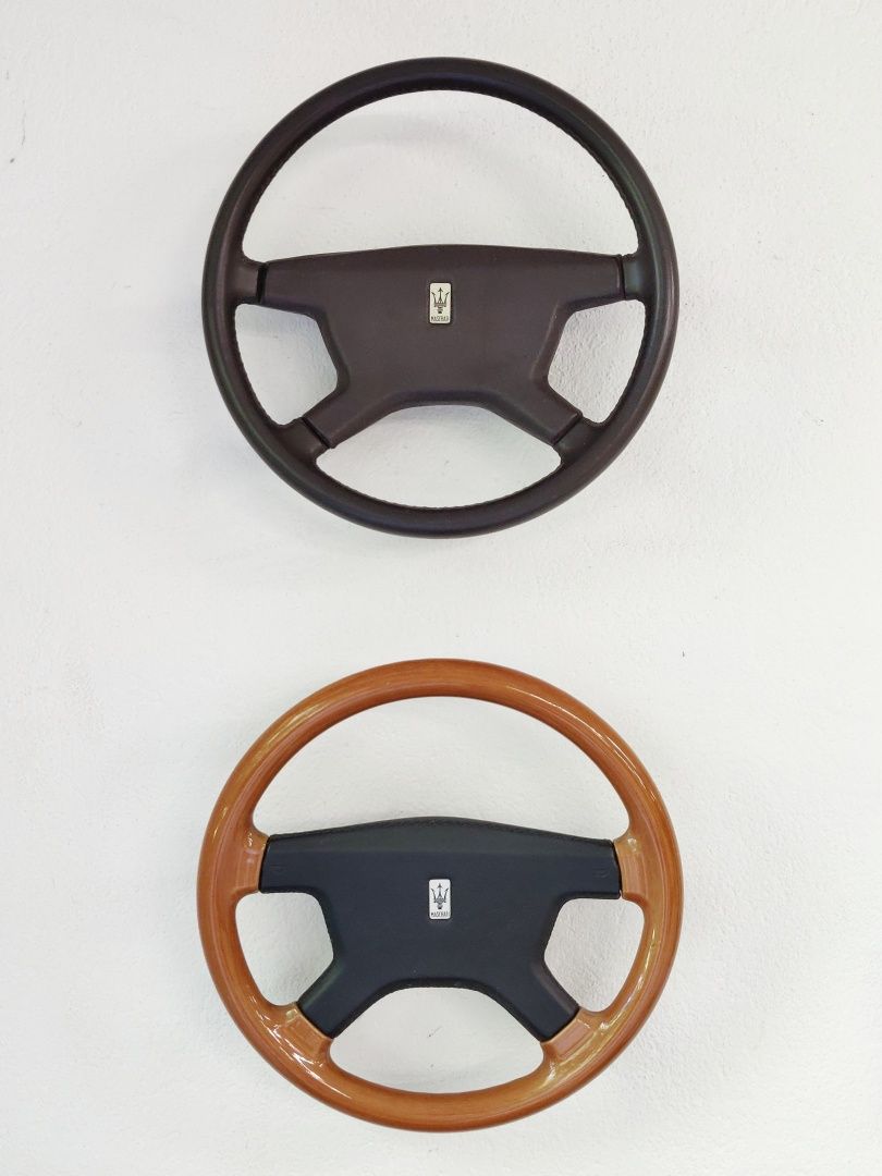 Deux volants, l'un en bois et cuir, l'autre entièrement gainé de cuir noir. Diam. : 37 cm.
