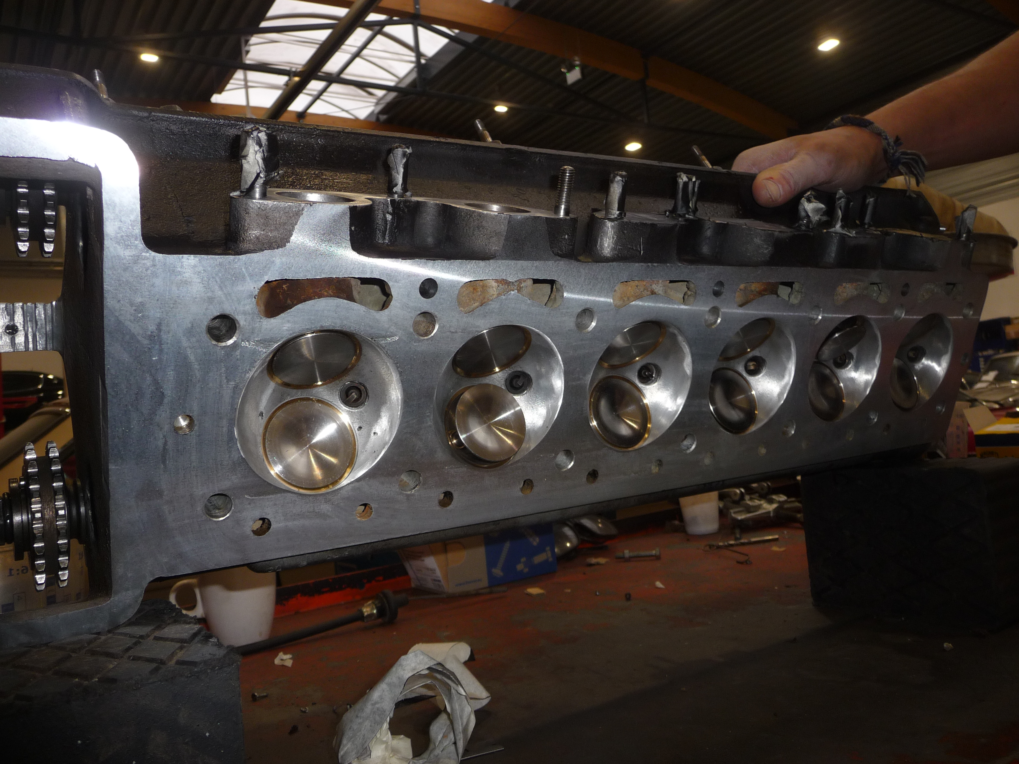 Test hydraulique, réparation par soudure de deux chambres fissurées, remplacement des guides des soupapes d'échappement, rectification des sièges, rectification des 24 soupape et surfaçage.