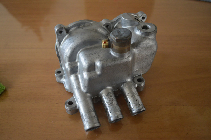 Étant donné que le collecteur d'admission a été laissé retiré à la fin de l'année dernière, j'ai retiré le coupleur du capteur de température de l'eau, retiré le tuyau du radiateur et retiré le couvercle du thermostat tout en retirant le LLC . Ceci est le couvercle thermique retiré. Le joint torique est toujours élastique et la section transversale reste ronde. Peut-il être utilisé? Puisque LLC reste, aspirez-le avec une seringue à mâcher et en plastique. Vous pouvez voir l'emballage du boîtier thermo sur le côté gauche (sur le côté droit lorsque vous faites face) où le thermo est inséré . Cela ressort beaucoup à l'intérieur. Je me demande si elle est à l' origine de cette taille ou si elle gonfle avec la chaleur. Au fait, les pièces détachées Euro sont en rupture de stock. Trois tuyaux sont coincés à l'arrière du boîtier thermique. Pour le refroidissement entre les berges gauche et droite et le turbo. J'ai réussi à retirer le collier de serrage de type calfeutrant que j'aurais dû remplacer lorsque j'ai remplacé le démarreur il y a longtemps, en le calfeutrant avec un tournevis à lame plate, mais il est fermement attaché et le tuyau ne se détache pas. Après avoir poussé le tournevis et pulvérisé le spray de silicone, j'ai réussi à le retirer avec succès.