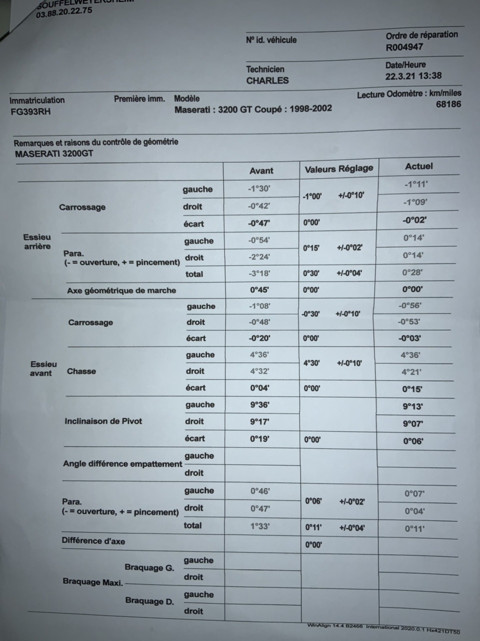 Et j ai fait faire parallélisme chez Vulcastra, grand spécialiste de la région. Vu le temps que ça leur prend, le forfait ça fait 160 e de l heure...bon c est un peu simpliste de compter comme ça. De l intérêt d être un expert reconnu. Et bien, il y avait avant, et finalement ce n était pas terrible, je le comprends maintenant. Il y avait après changements des rotules et bras. Et la c’est limite dangereux à conduire.... ça se baladait dans tous les sens. Et il y a après le parallélisme. Une autre voiture. Avant je roulais doucement, je vais pouvoir pousser un peu. Et je promets que je vais chercher à comprendre sérieusement les valeurs que ça désigne.