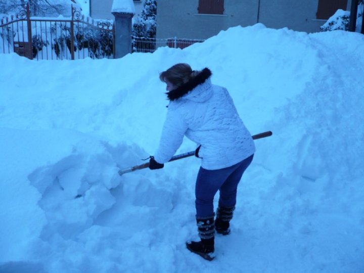 Mme déblayant devant son garage