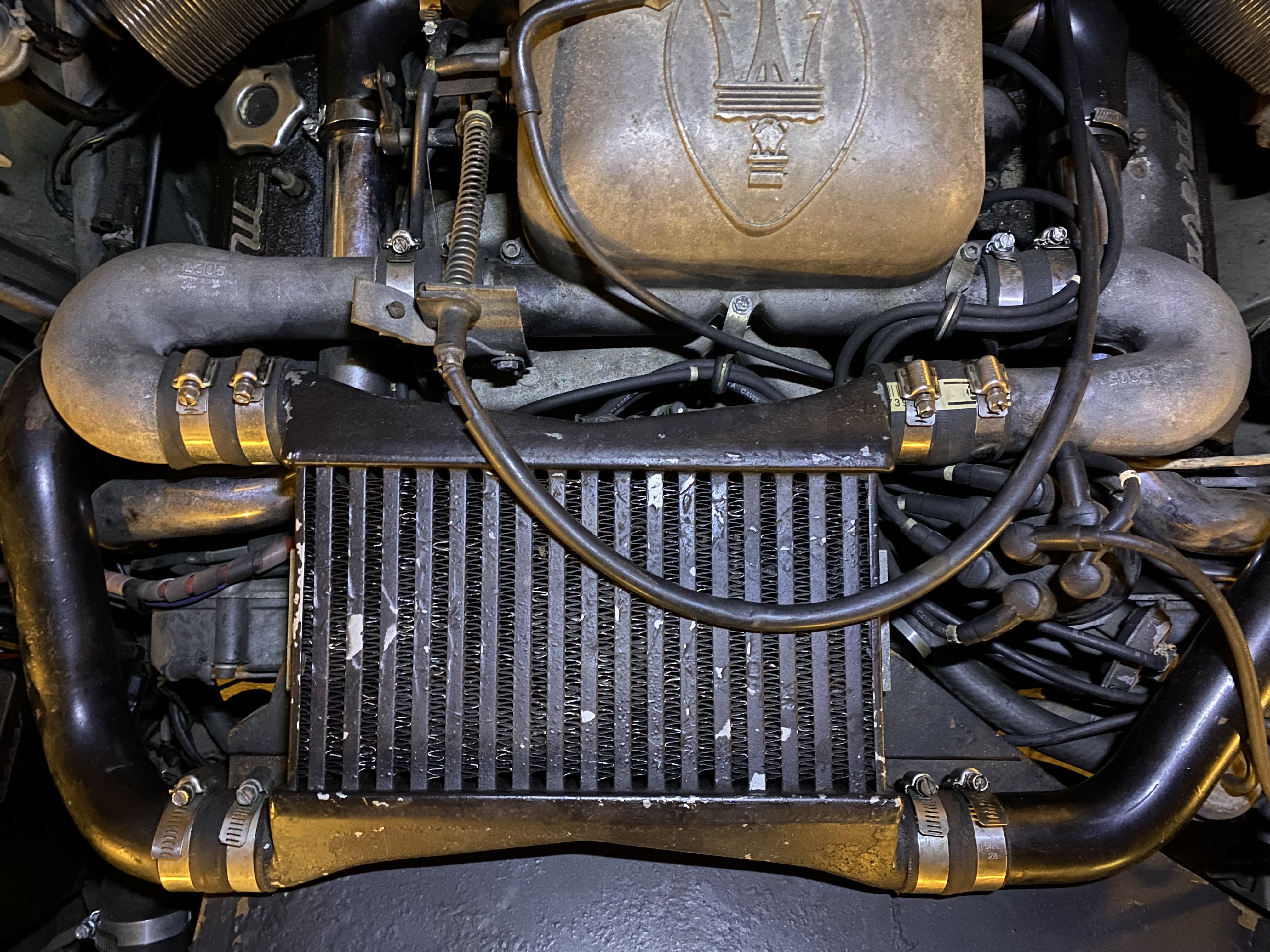 Pour compenser le lourd système de dépollution (tout un tas de tuyauterie supplémentaire, de pompe, d’admission d’air, pot catalytique, etc…), Maserati avait installé un intercooler air/air Spearco bien avant l’introduction d’intercoolers sur tous les modèles pour compenser la perte de puissance du 2.5