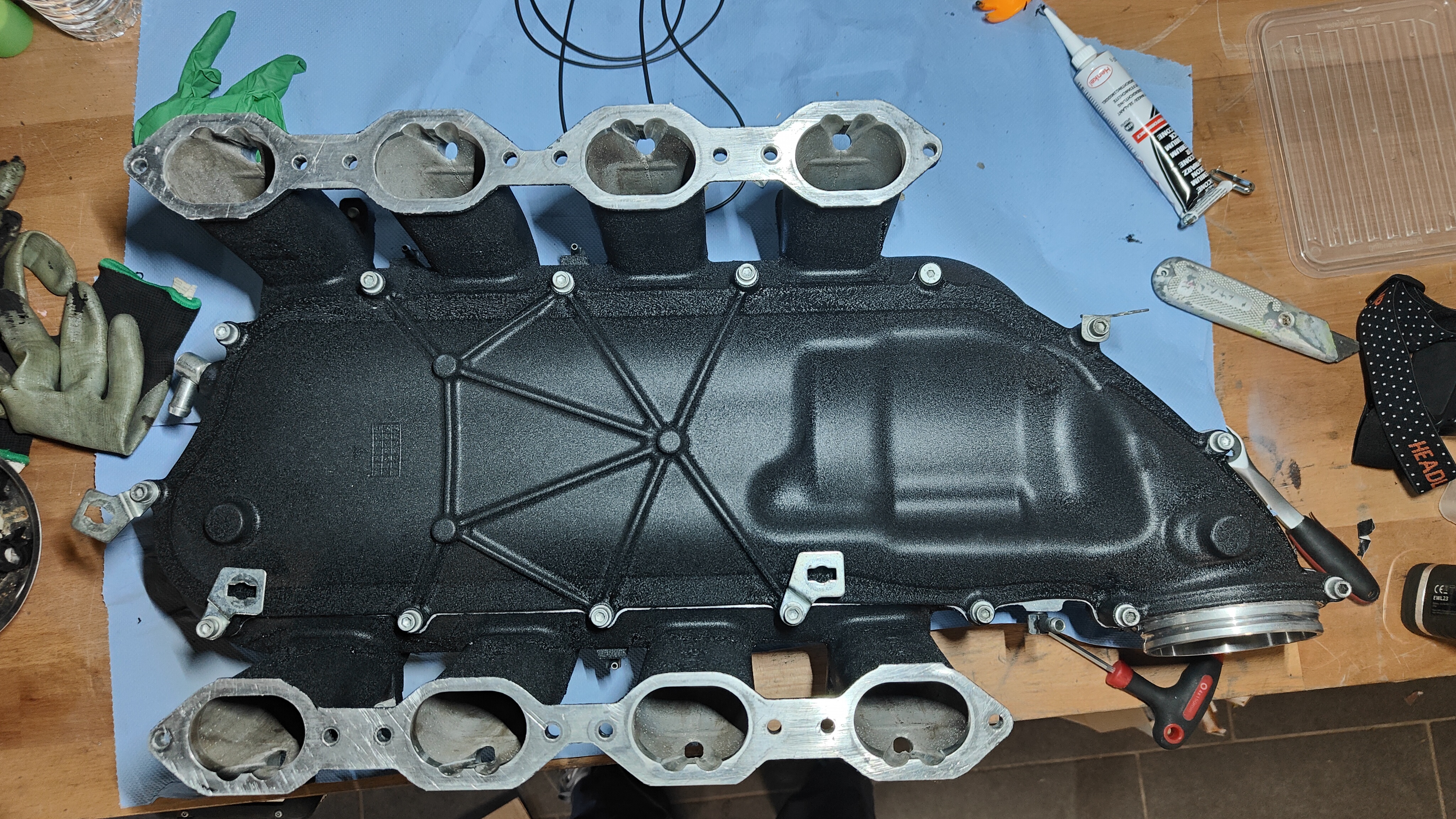 Demain, je sable la grosse pièce. Je me tracasse pas trop du risque de mettre du sable dans l'admission. La pièce repasse après çà par la case nettoyage dans le grand bac évier du garage avec du produit vaisselle pour être sûr de bien dégraisser, puis jet d'eau et soufflette.