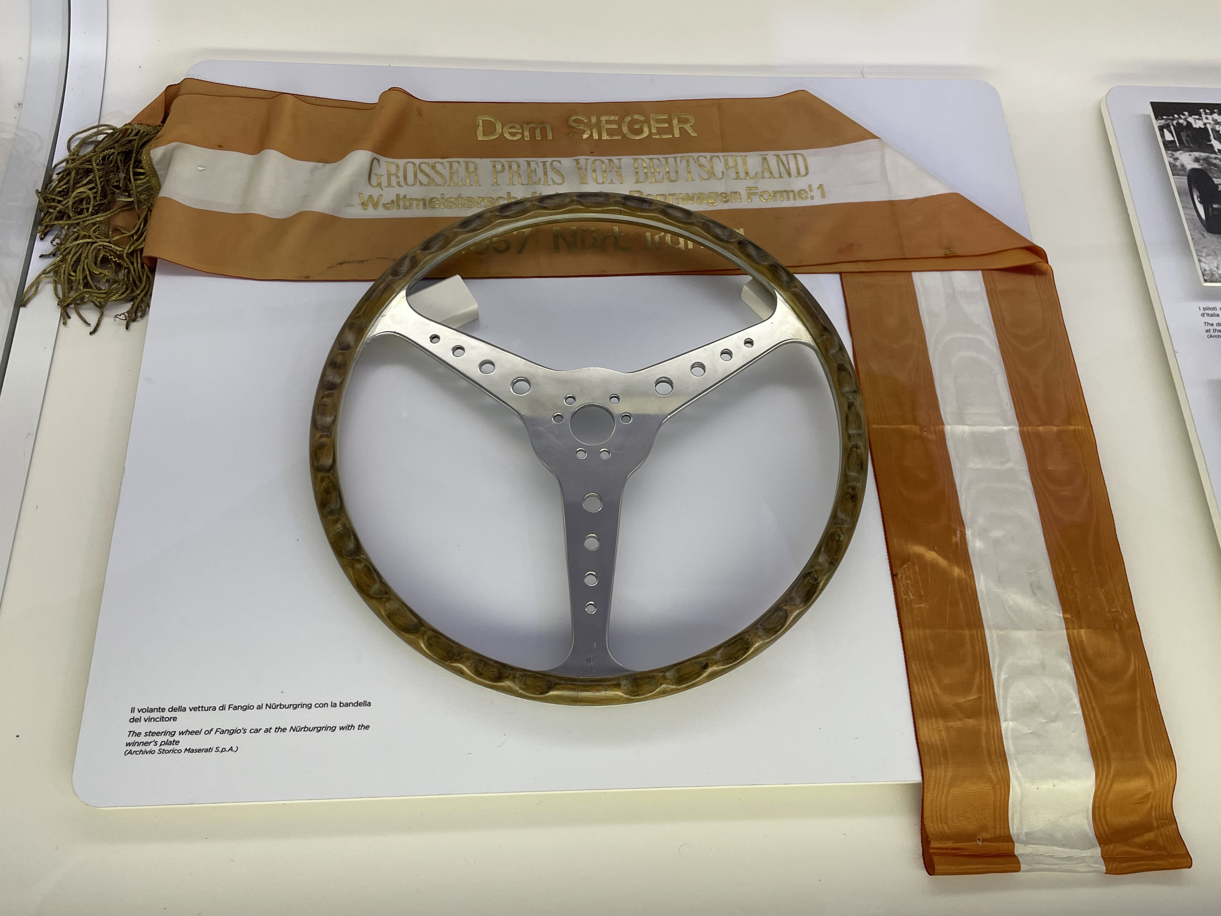 Alors ça, c'est la perle de la vitrine du MEF : le volant de la 250F avec laquelle Fangio remporta le Grand Prix d'Allemagne 1957 au Nurburgring . On a aussi l'écharpe du vainqueur. Ce fut "la course du siècle", le record du tour battu presque à chaque tour par un Fangio en état de grâce ! Un moment fabuleux de l'histoire de la course automobile et, à l'issu de la course, le titre de champion du Monde de Formule 1 constructeur pour Maserati et pilote (5ième fois) pour Fangio.