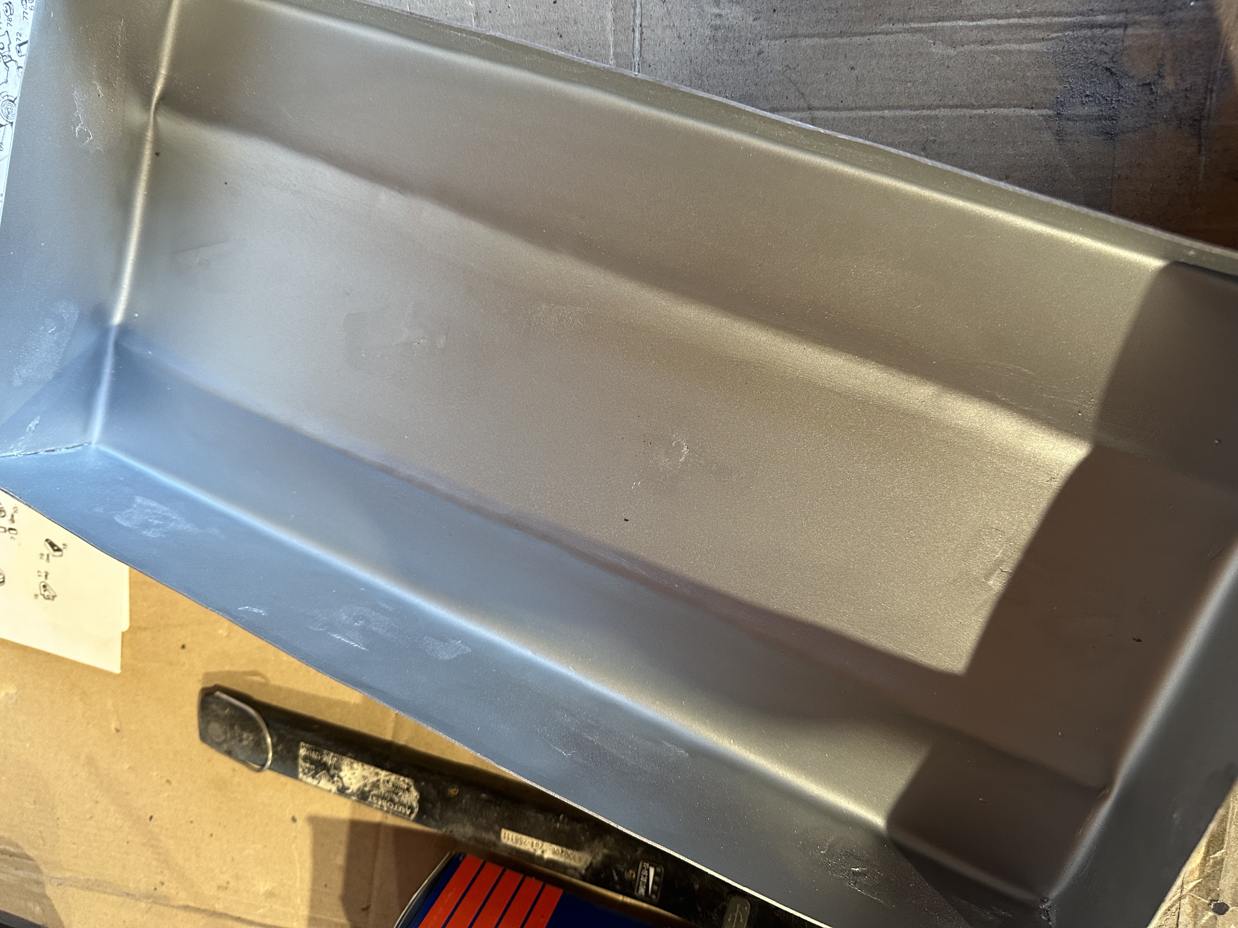 L'étamage est fait exprès pour ce type de réparations suite à un ancien accrochage sur l'aile, de toute façon, c'est mieux que du mastic, ça avance, aprêts garnissant mis, attente séchage