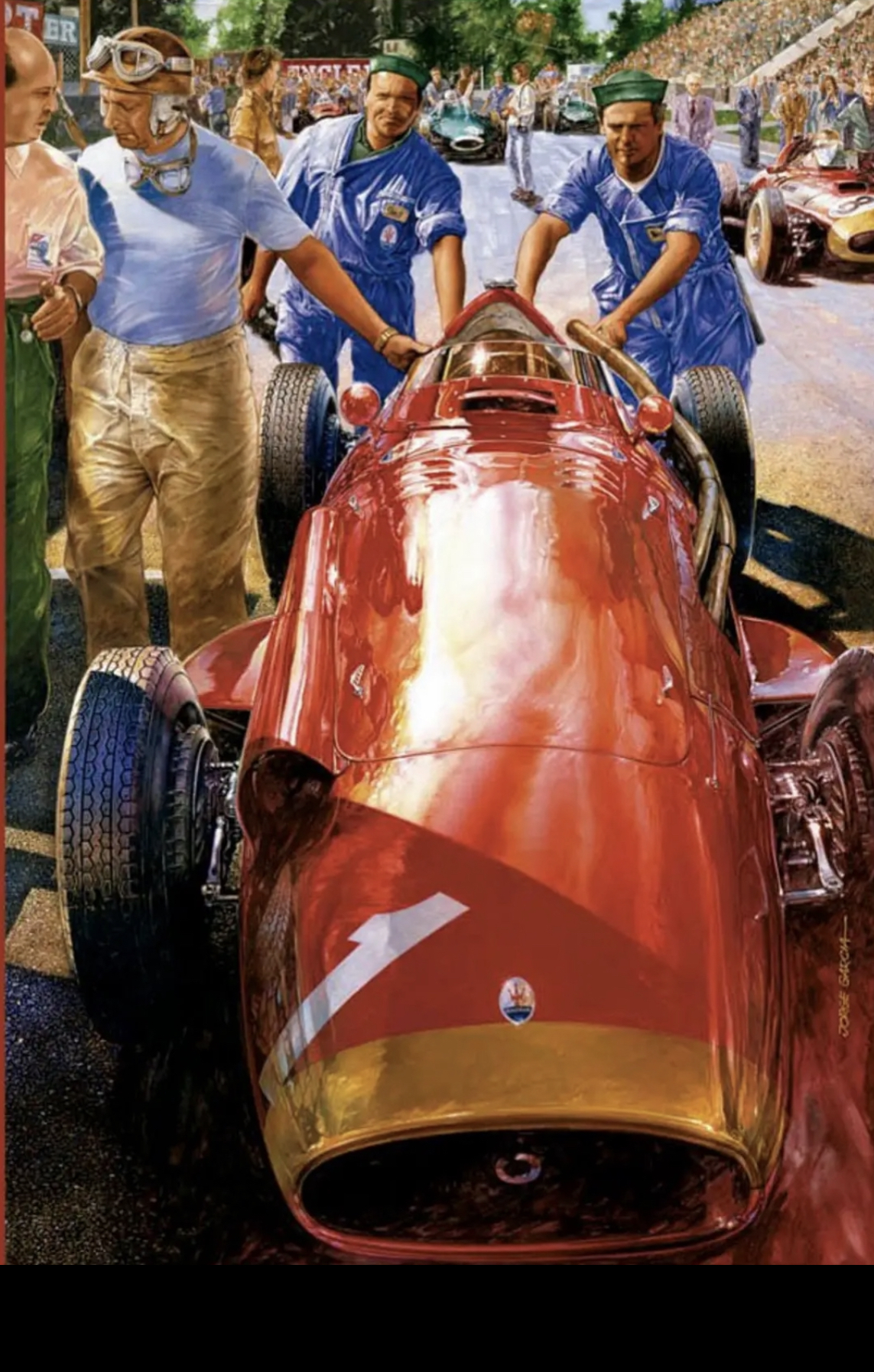 Nurburgring 1957, la course du siècle comme on l’a appelée, Bertocchi et Fangio et la 250F sur cette belle peinture :
