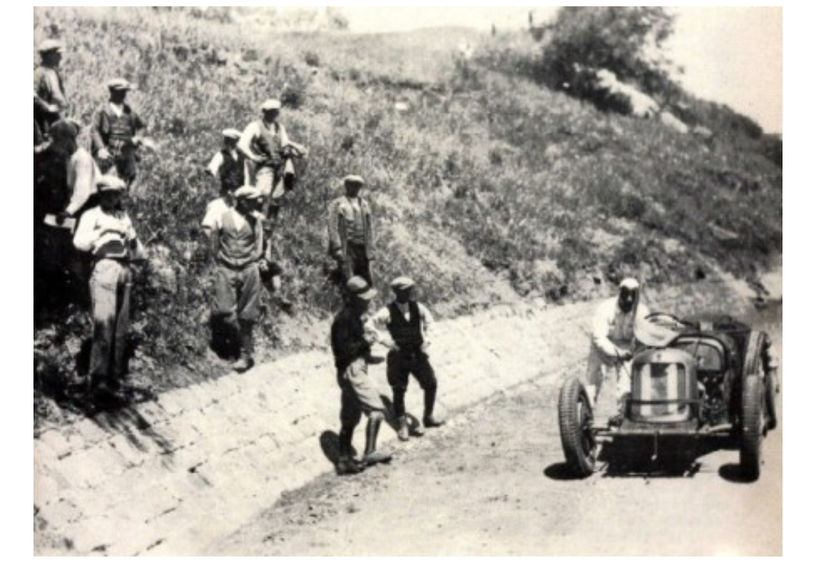 Maserati-Bugatti Speziale de Clemente Biondetti photographiée lors de la Targa Florio de 1932. Construite avec un moteur Maserati 8 cylindres et une calandre où semble figurer le logo Maserati, fixée à un châssis Bugatti (semble-t-il un T35).