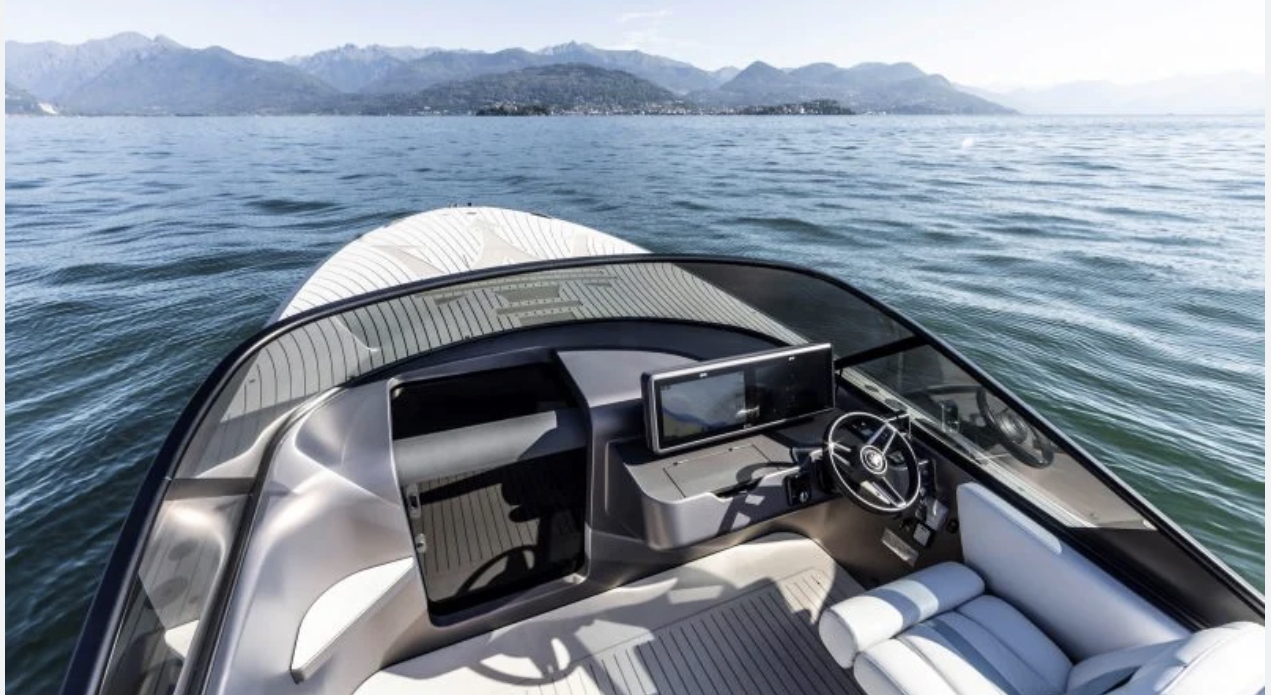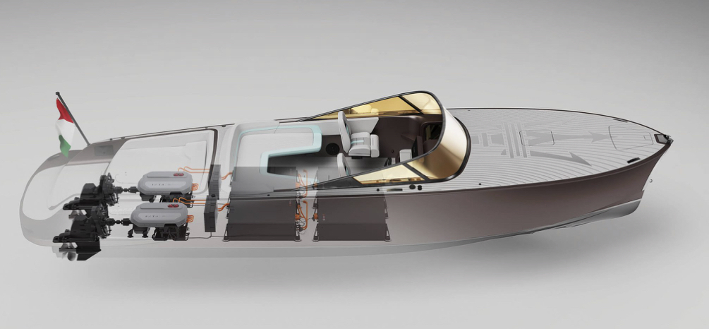 Le canot Tridente est une unité en fibre de carbone de 34 pieds (10.3 mètres) propulsée à une vitesse maximale de 40 noeuds par deux moteurs électriques totalisant environ 600 cv. A la vitesse de croisière de 25 noeuds, l’autonomie est de 70 kilomètres, suffisante pour les lacs italiens ou pour un Cannes-Monaco. Les quatre batteries stockent au total 256 kWh et se rechargent en une heure sur borne DC.