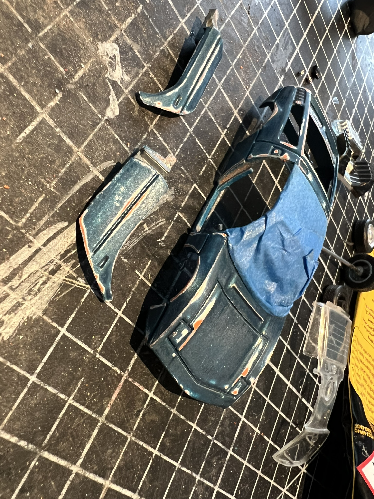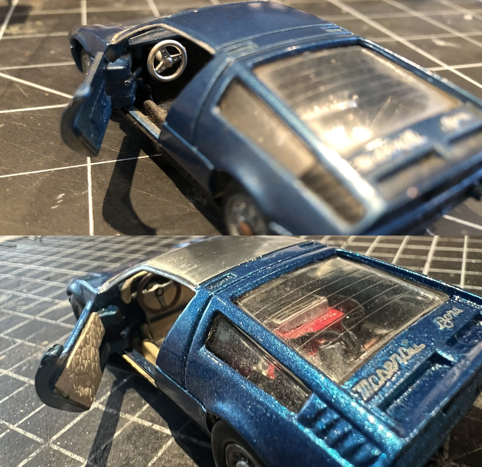 Pour le reste, après nettoyage à la solution vinaigrée ( 20%), je repeinds l'intérieur en beige. Je fais les contre-portes et les sièges en cuir beige. J'adapte un tableau de bord issu de mon stock de pièces détachées. Je modifie et repeinds des roues d'une BORA G&P en statut épave. J'en profite pour adapter feux arrières, calandre et parechocs + un rétro. J'ai customisé aussi l'arrière avec un moteur visible et plus détaillé.