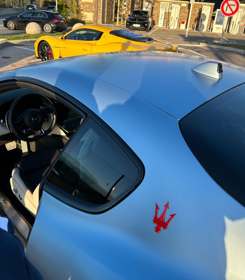 Nous nous retrouvons vendredi 29 novembre en milieu d’après midi à la station de l’Estérel près de Fréjus. Voici nos deux bolides, la MC20 Giallo Genio de Michel (que j’avais déjà essayée) et la GranTurismo Trofeo 75th anniversary d’Olivier (75 exemplaires au monde, 2 en France) :