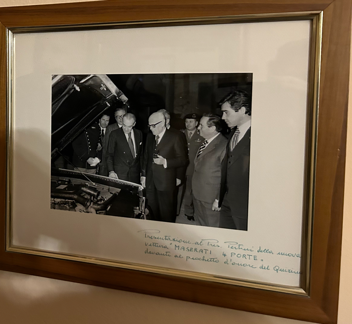 Des souvenirs sur les murs de la maison de notre ami. Présentation de la Quattroporte III par Alejandro De Tomaso au président Sandro Pertini. Ermanno est tout à droite de l'image :