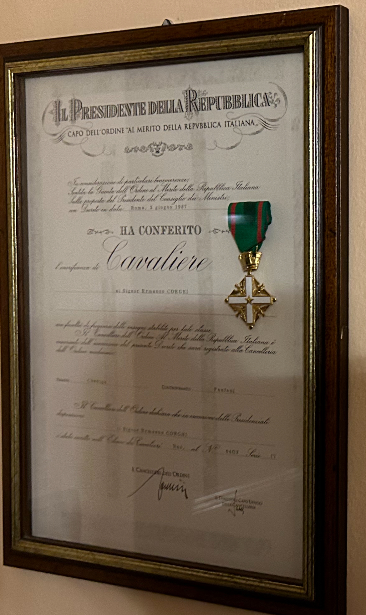 Sa décoration de Cavaliere dans l'ordre du mérite de la Repubblica Italiana :