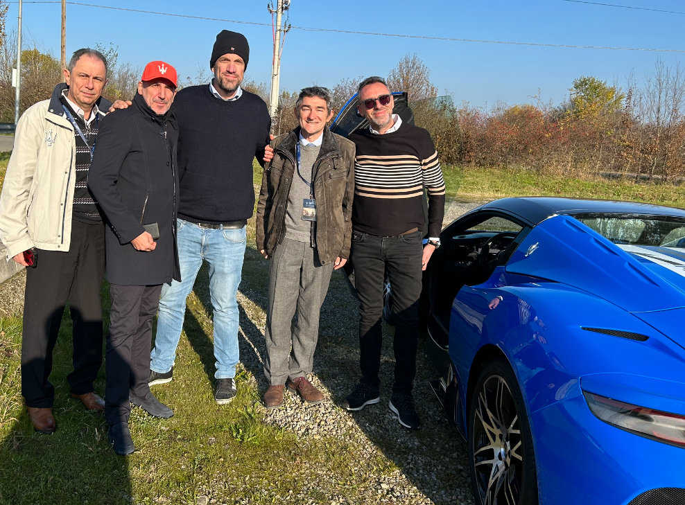 Sur le parking de l’Autodromo, votre serviteur entre Alberto et Ettore Maserati, Olivier et Patrice à gauche, la Maserati per Maserati à droite :
