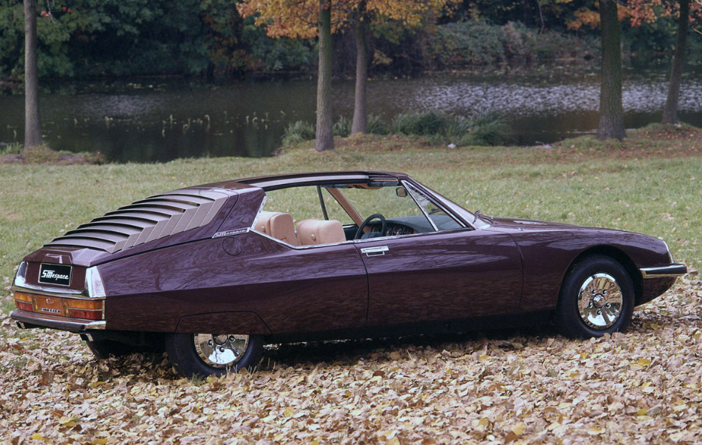 La SM espace Heuliez, aubergine et première du nom, fut présentée au salon de Paris 1971. On voit bien les échappements rectangulaires :