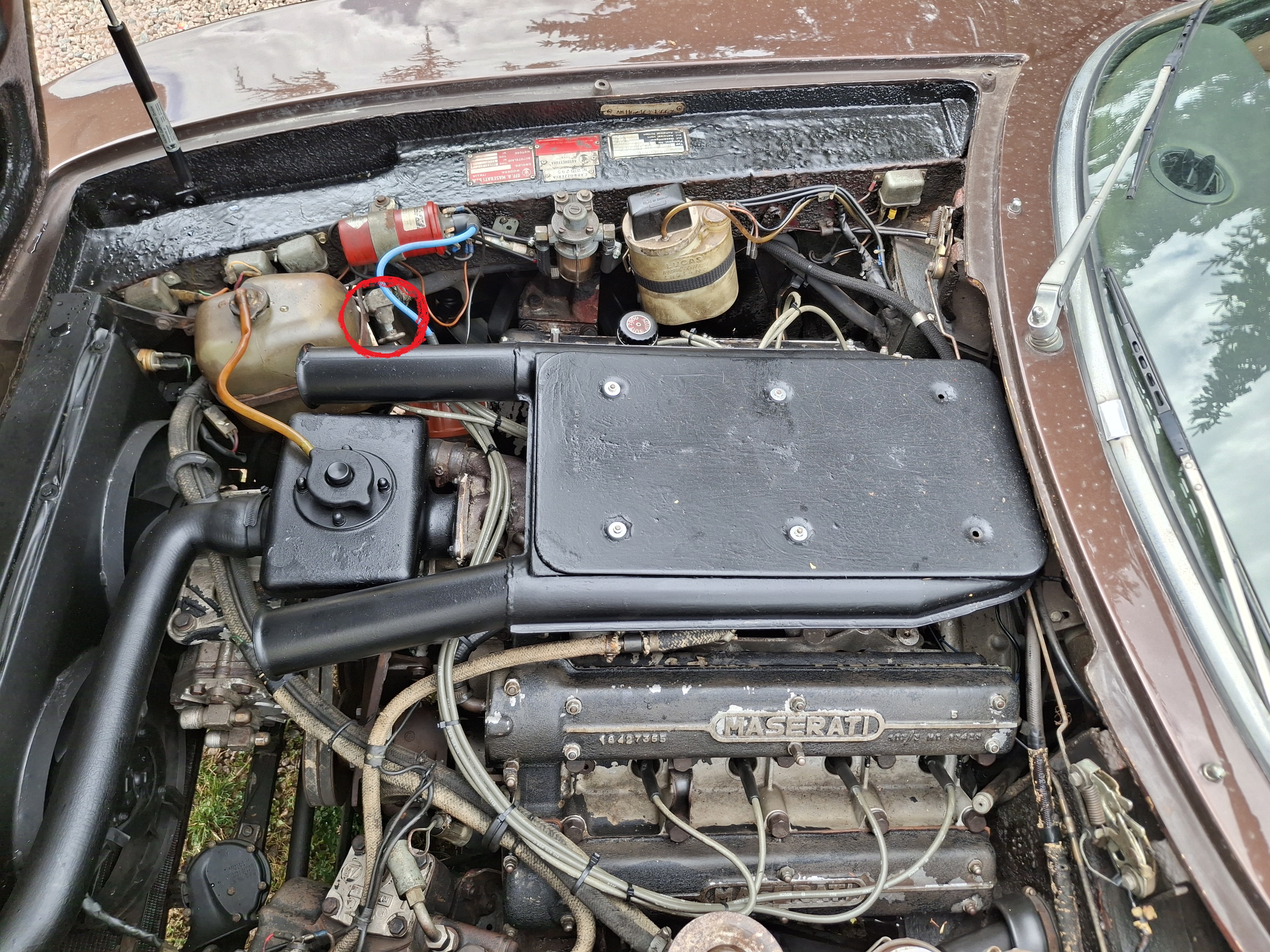 La vanne de réglage du débit d'eau de chauffage est située sur la droite également dans le V, fixée sur le haut tout au bout de la culasse droite, juste sous le niveau bas des carburaturs.
