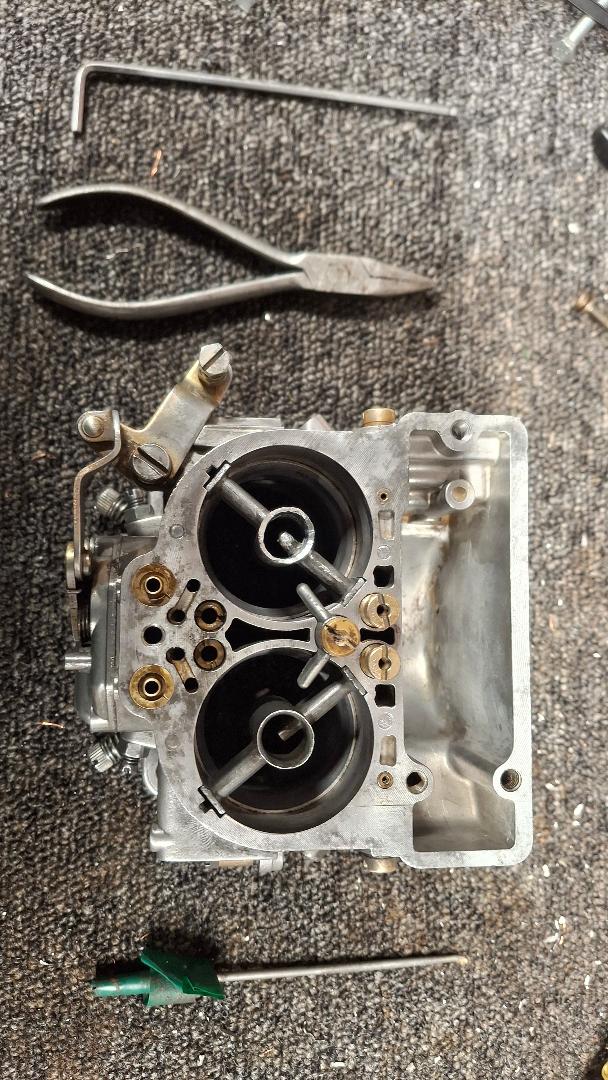 J'ai également attaqué la rénovation des 4 carburateurs, pratiquement 1 journée de travail par carbu, voir plus, un travail hyper méticuleux. Kit de maintenance pour les 4 doubles corps acheté en Allemagne, nettoyage micro onde et pas de dommages constatés, très peu d'usure, seulement bien encrassés après ces longues années de non fonctionnement.